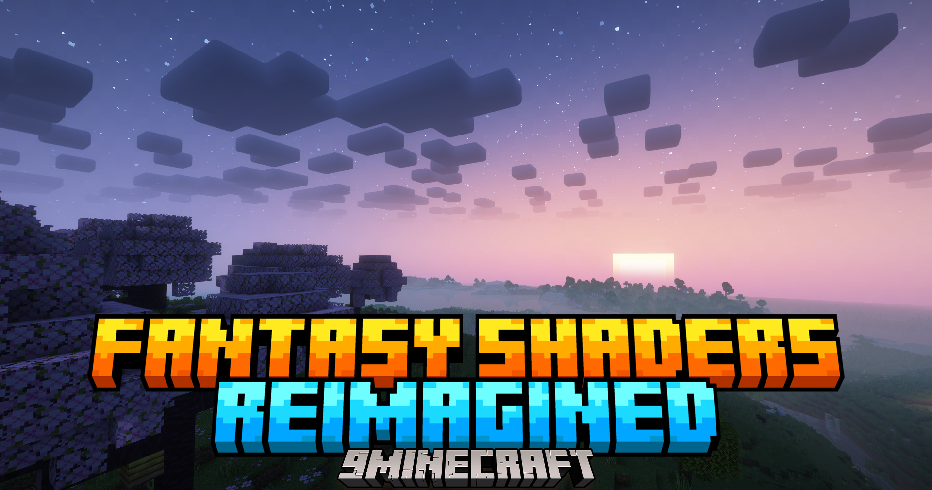 Fantasy Shaders Reimagined Shaders (1.21.11, 1.20.1) change the sky and time-of-day palette. Night is shifted into a fantasy blue tone across the sky and sky effects (auroras, clouds, nebulas). Daytime is pushed brighter, with a white horizon and a lighter blue upper sky, and both sunrise and sunset are made more colorful.