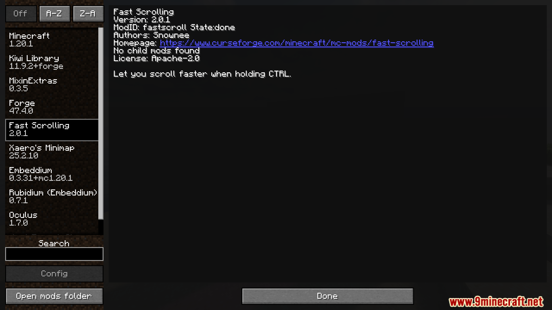 - Increases scrolling speed by four times when holding CTRL, making navigation through inventories, menus, and mod GUIs faster and more efficient.