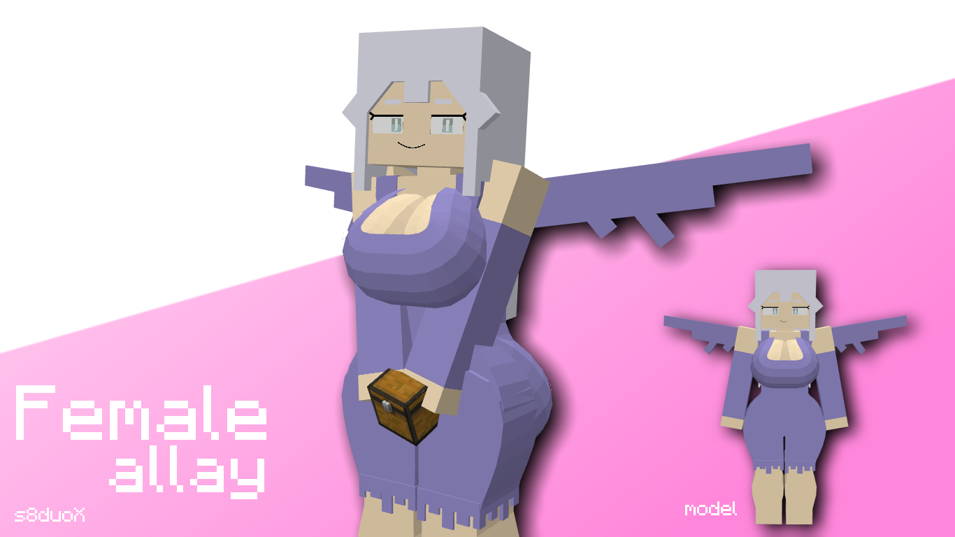 Female Allay For Bee Jenny Mod Model replaces old Bee girl with this anthropomorphic female Allay design featuring silver/gray hair, glowing blue eyes, purple form-fitting dress emphasizing curves, large bat-like purple wings, holding a chest (nod to Allay’s item mechanic).