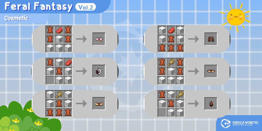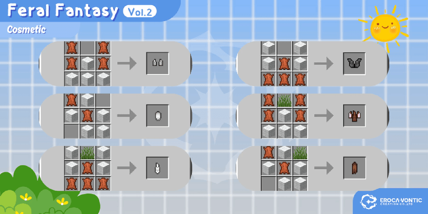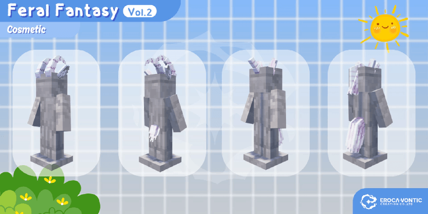 Feral Fantasy Vol.2 Addon (1.21) offers a variety of animal ears and tails completely free of charge. These accessories are used to change the character’s appearance or for role-playing activities. The contents include a full range of parts such as ears, horns, and tails of various animals including cows, deer, goats, horses, and sheep.