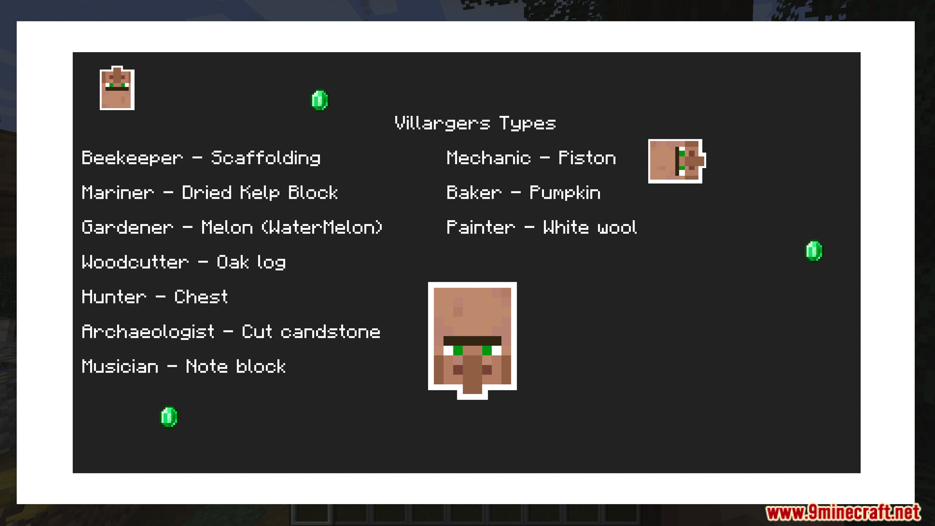 - The mod adds new professions such as Oceanographer, Netherologist, Forester, Miner, Hunter, Painter, Gardener, Woodcutter, Mechanic, Musician, Baker, Archaeologist… Each profession corresponds to a separate workstation, and if the correct workstation is placed, the villager can receive that profession.