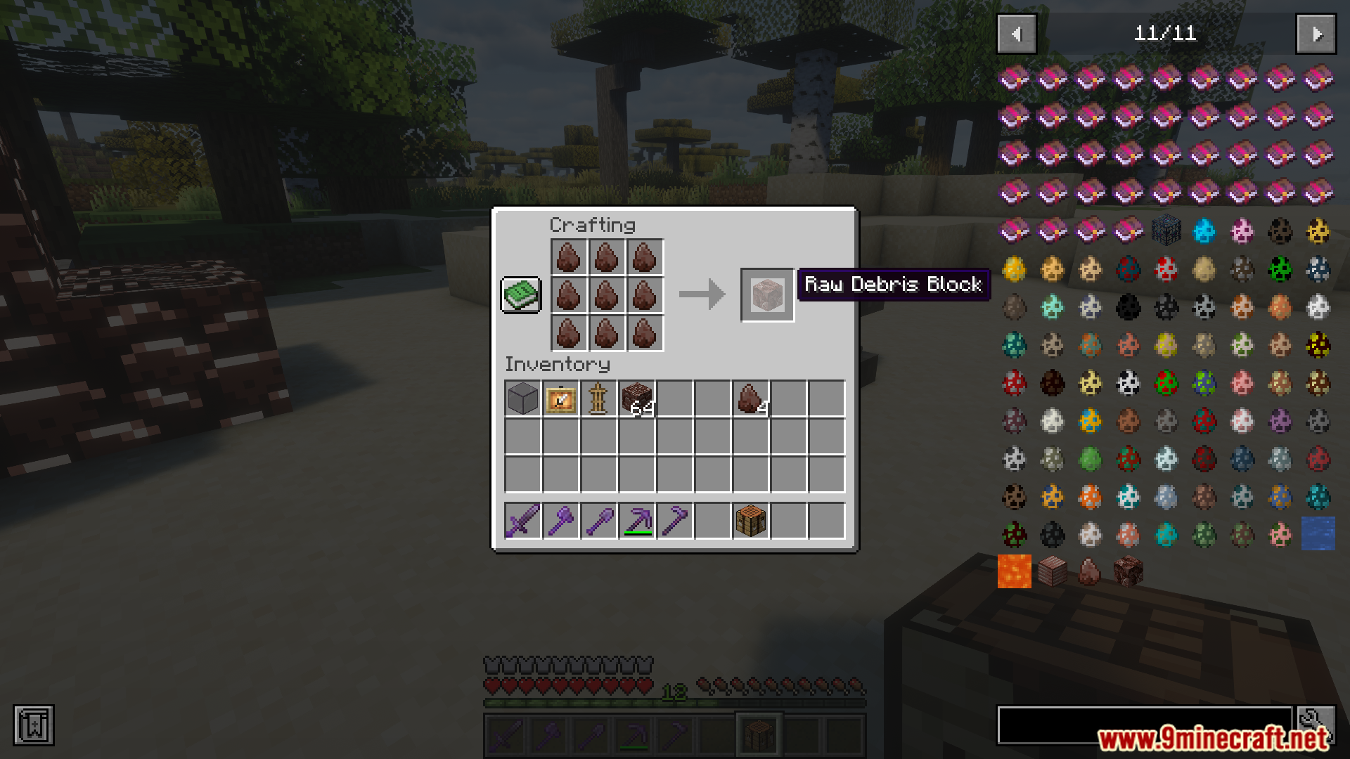 - Fortune enchantment increases drops (1–4 Raw Debris).