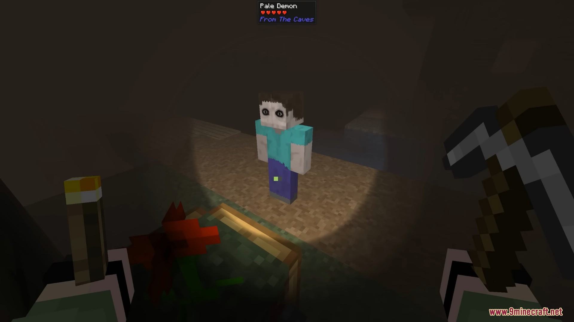 From The Caves Mod (1.20.1) adds a mysterious stalking entity to Minecraft that can follow you both underground and on the surface. This mob interacts with blocks, mobs, and the environment, creating unpredictable situations and scares.