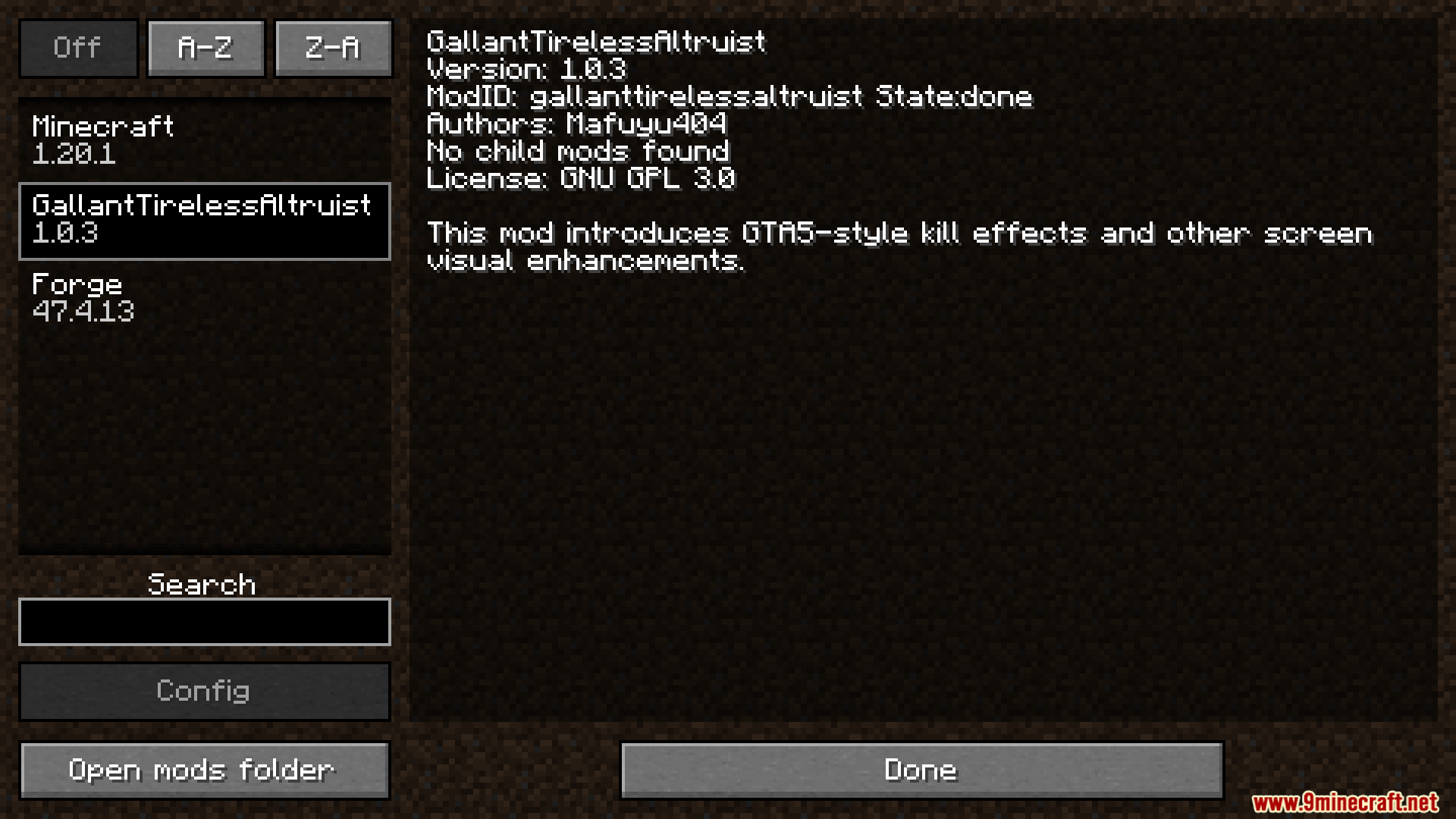 Gallant Tireless Altruist Mod (1.21.1, 1.20.1) adds GTA V‑style kill and damage screen effects, enhancing combat visuals with saturation shifts, blur, and vignette overlays.