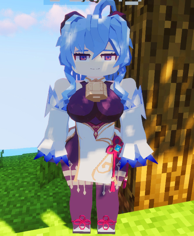 Ganyu Jenny Mod Model replaces the old model with Ganyu from Genshin Impact. The model captures her half-qilin design: flowing blue hair with dark tips, red horns, purple eyes, elegant black/white/purple qipao dress with bell accessories, thigh-high stockings, and icy Cryo effects.