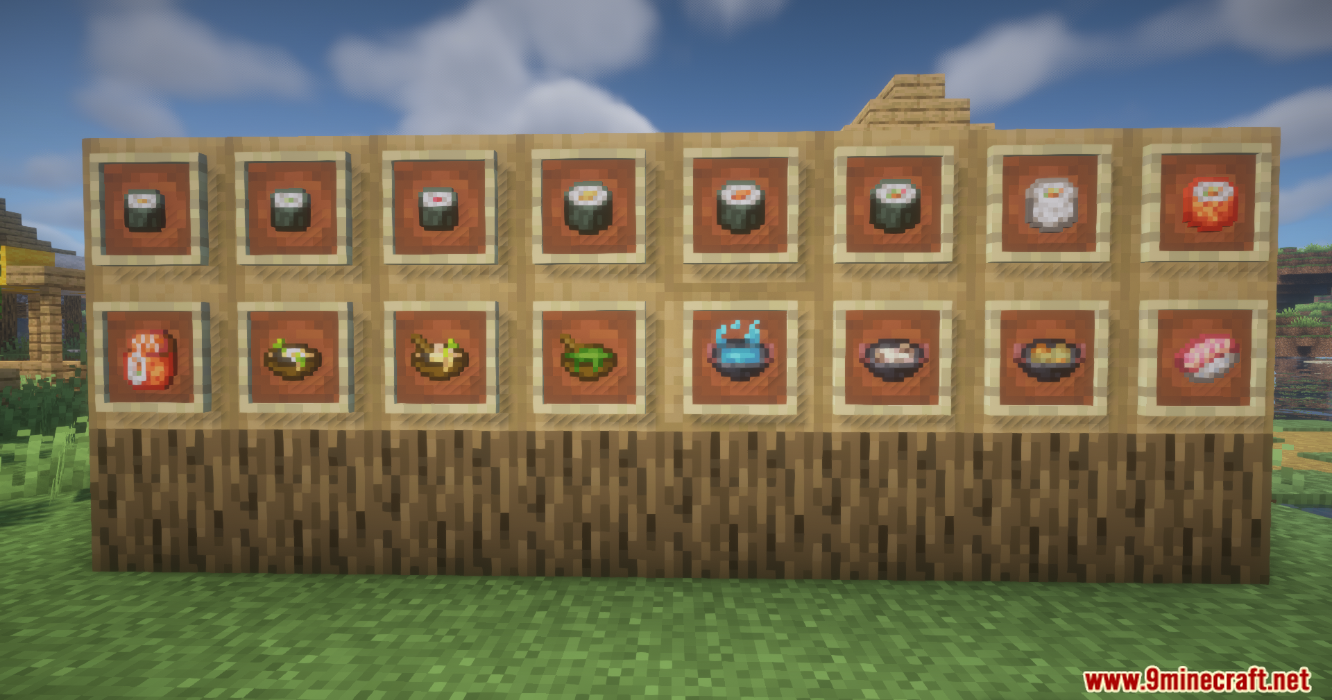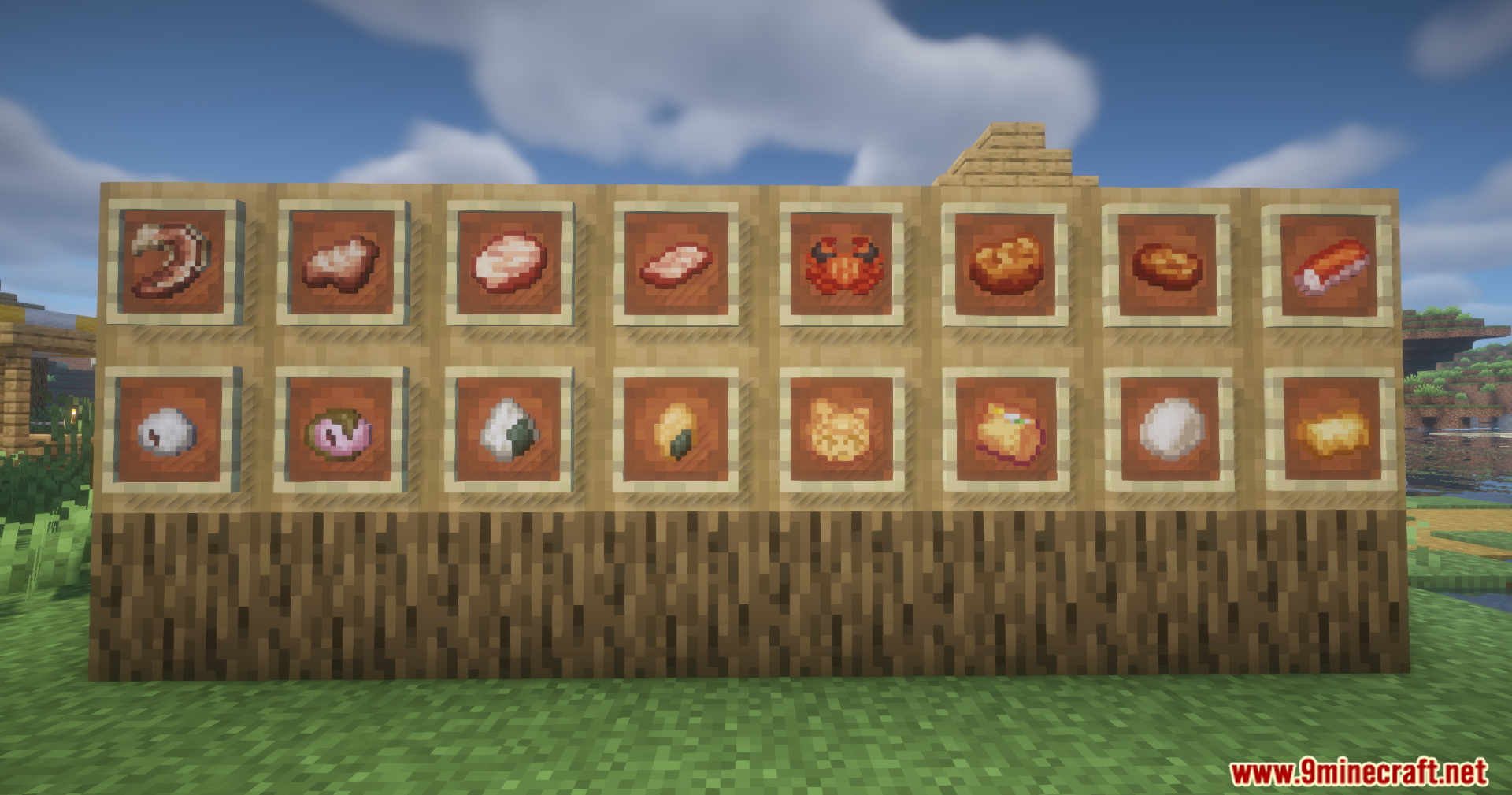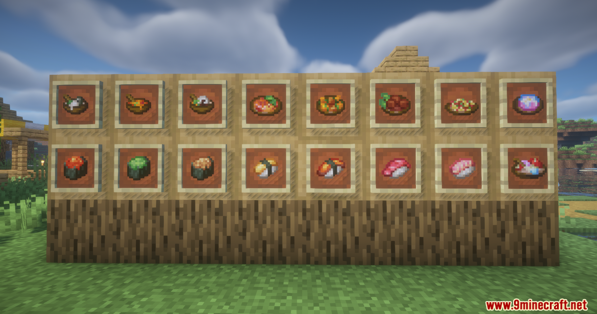 - Adds 143+ food items, including edible ingredients, simple dishes, placeable feasts, sushi, and drinks.