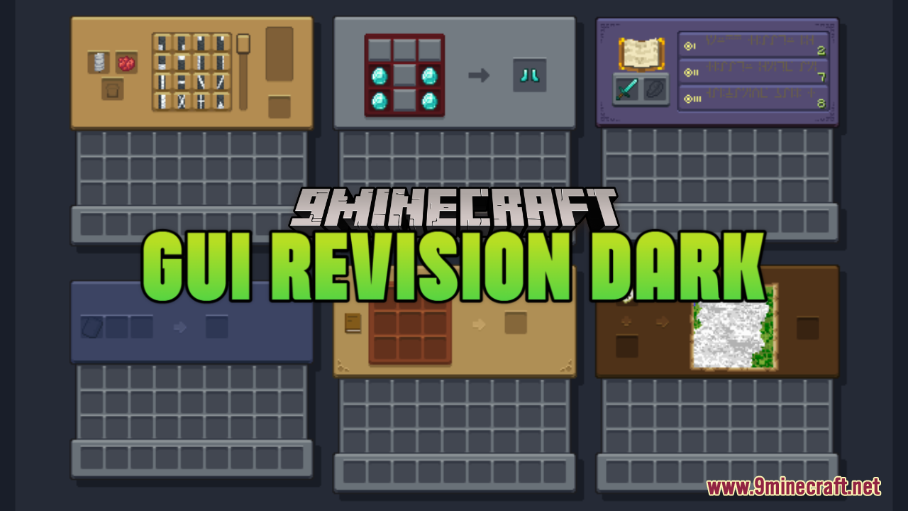 GUI Revision Dark Resource Pack (1.21.10, 1.20.1) simply offers a sleek, modern overhaul of Minecraft’s user interface by applying a dark-themed aesthetic to nearly all GUI elements – including inventories, chests, crafting menus, and mod-container screens. lthough the core focus is visual, the developer recommends using OptiFine or similar tools (like OptiGUI) for the best experience – meta features such as custom container layouts or mod-supported screens may use extended capabilities. In general, this clean pack revamps the vanilla GUI with a darker and cleaner look.