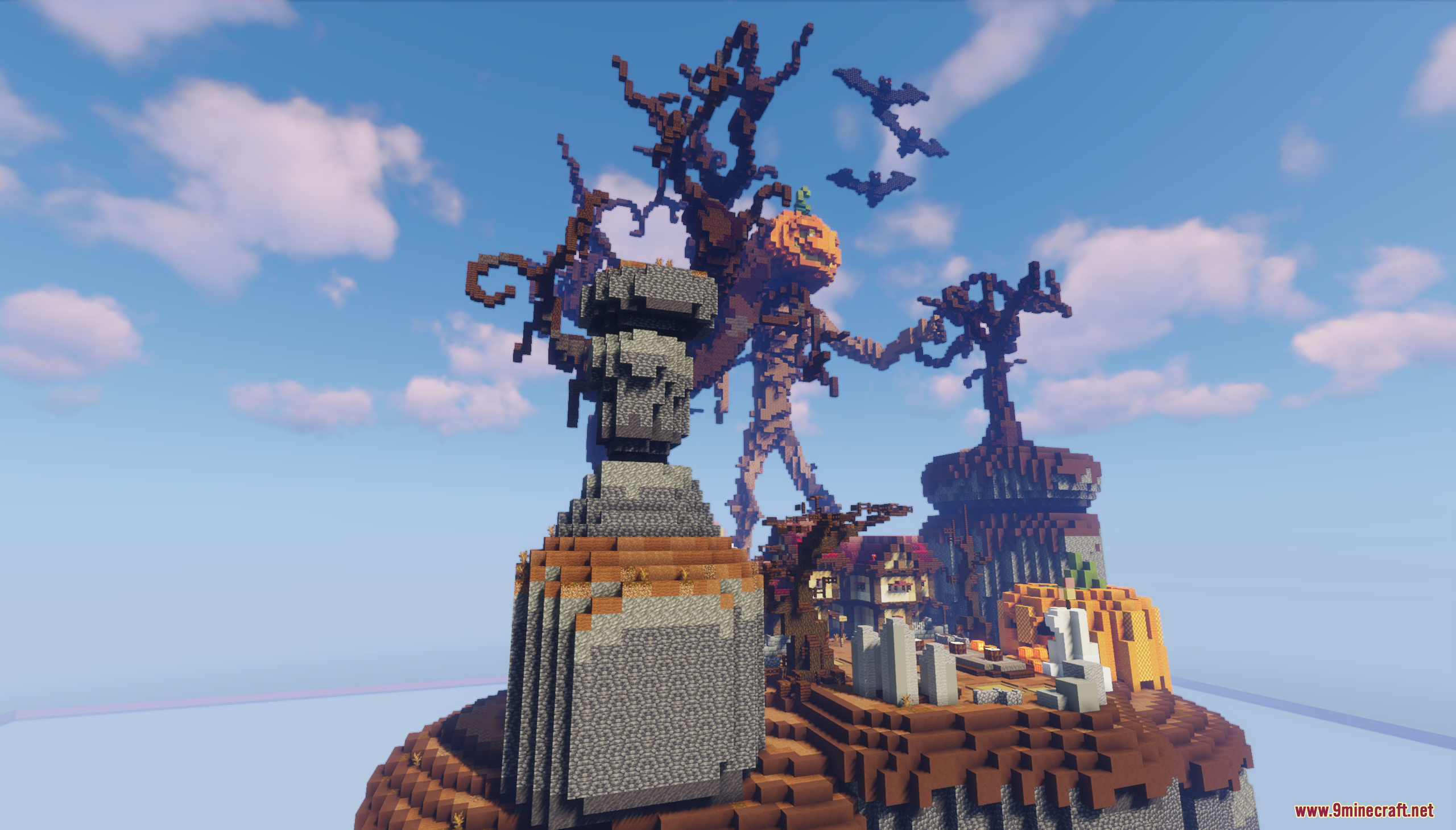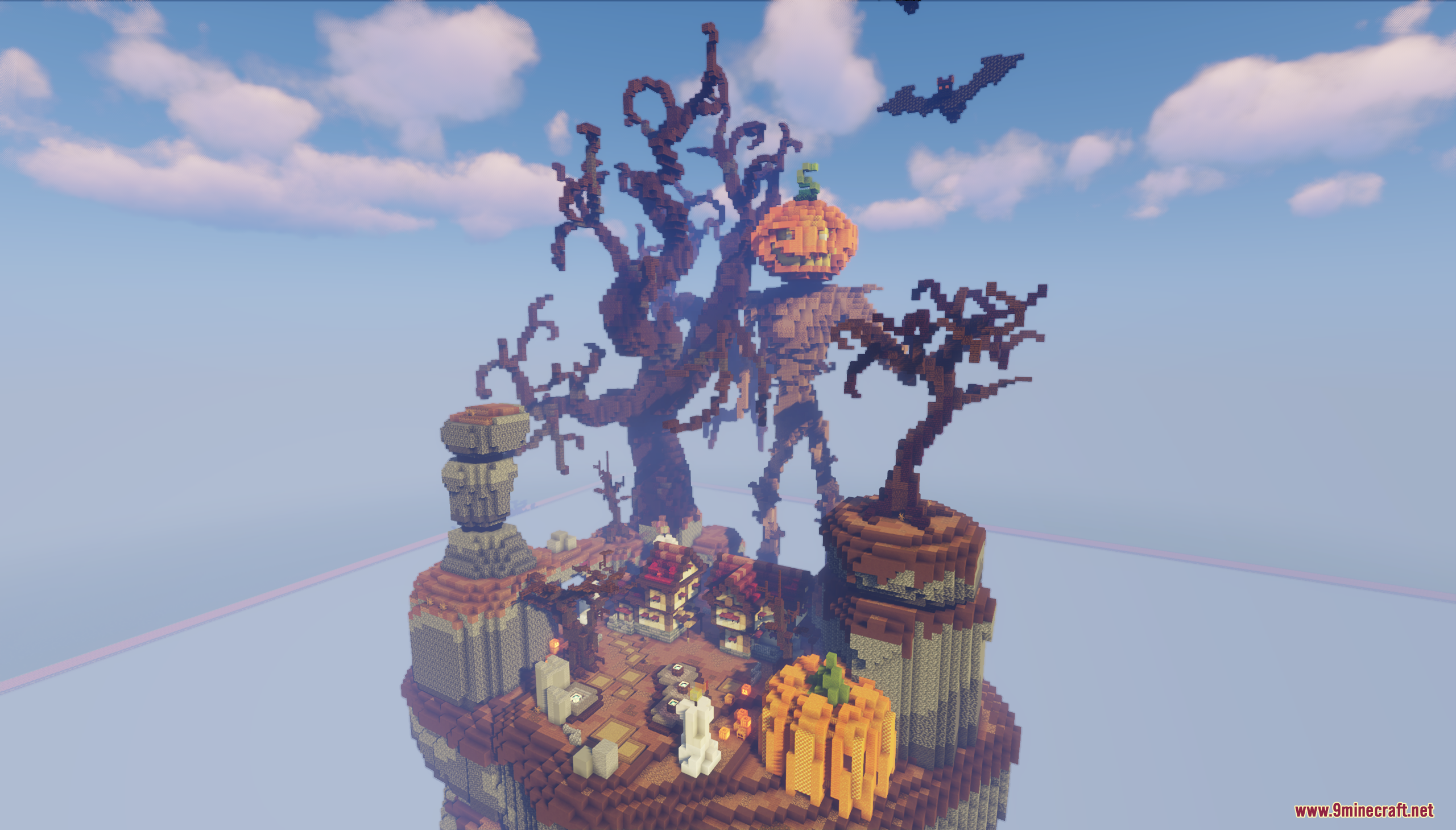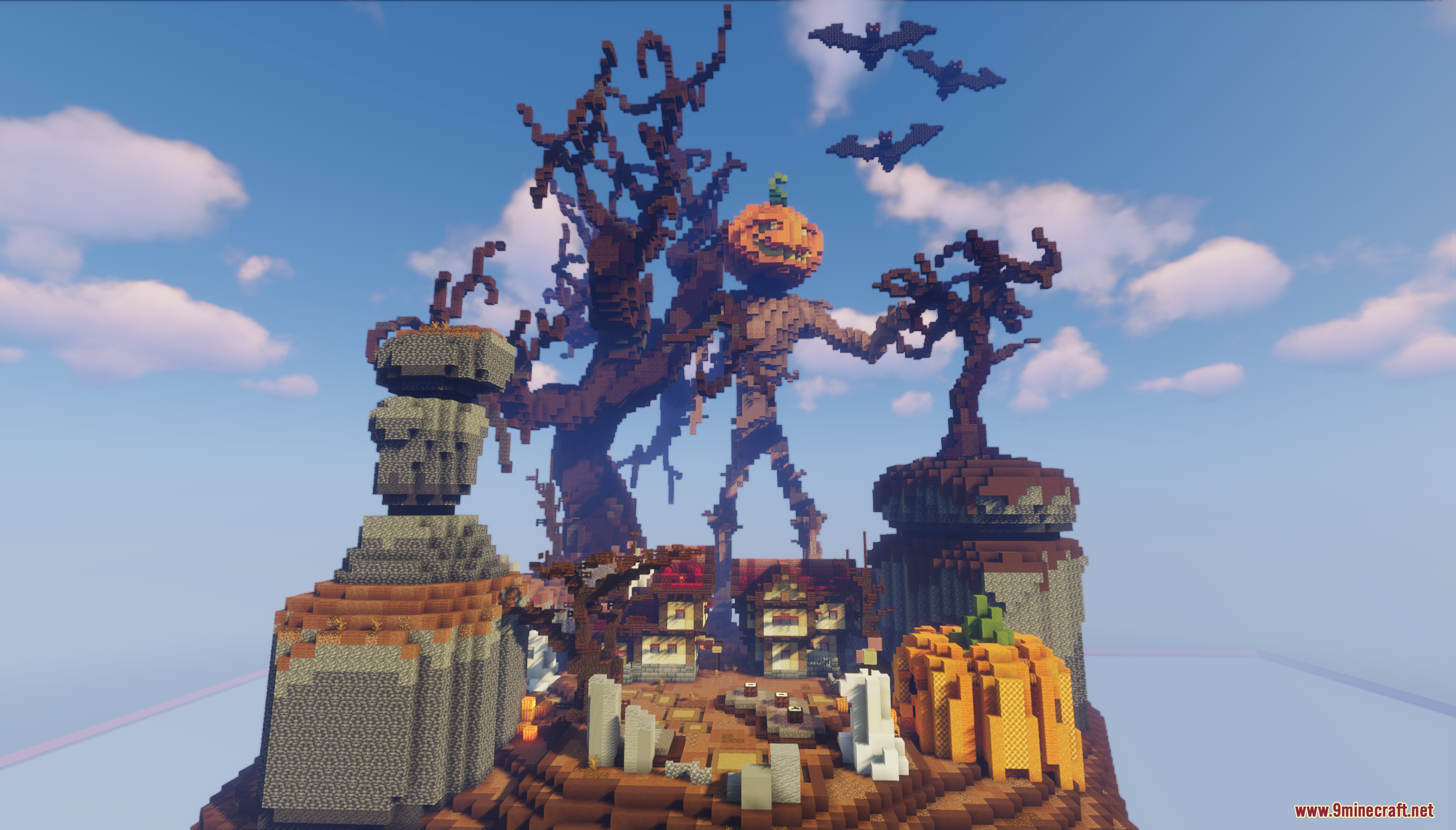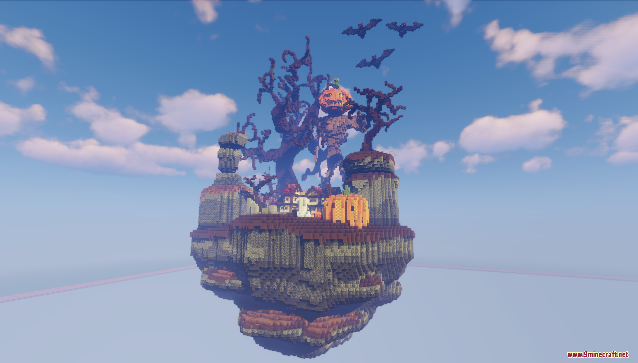 Halloween Spawn Map (1.21.10, 1.20.1) is here to capture the spirit of the spooky season. Floating high above the ground, it features eerie twisted trees, glowing candles, rugged stone formations, and a colossal pumpkin-headed creature towering over the landscape. With detailed custom pumpkins, bats circling the skies, and three designated NPC spots, this map makes a perfect Halloween hub or spawn area for any server looking to enchant players with a chilling yet magical vibe.
