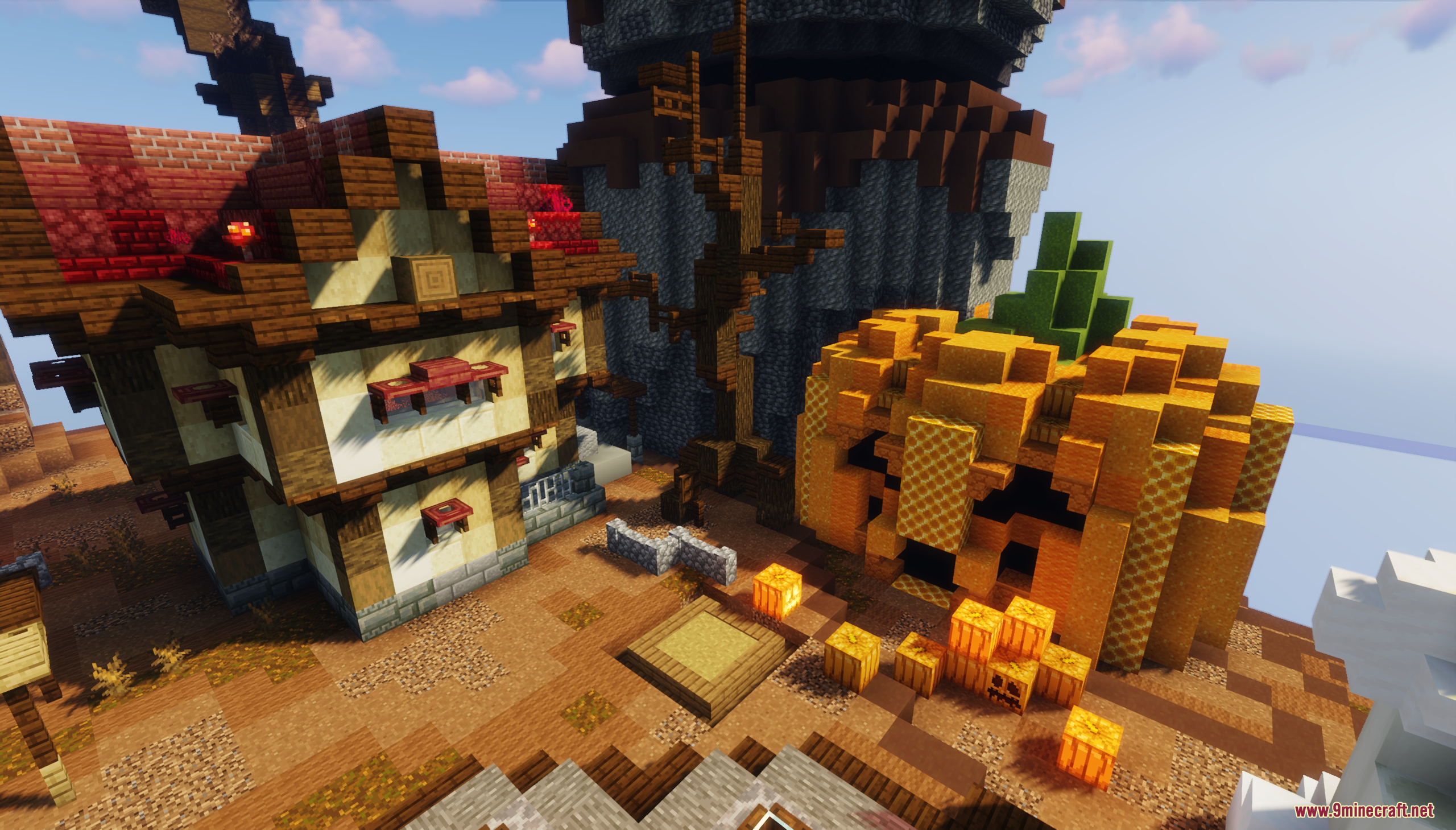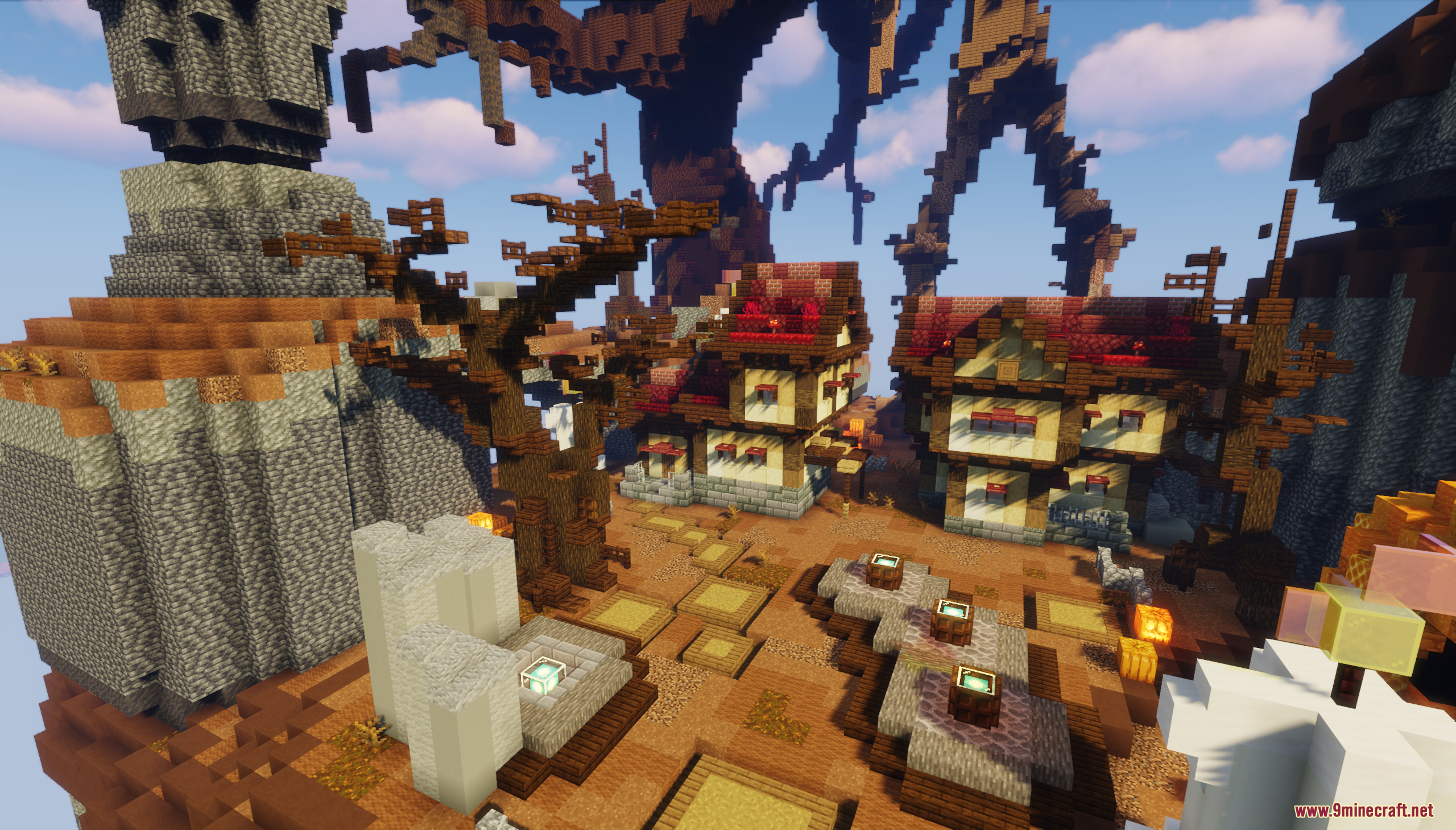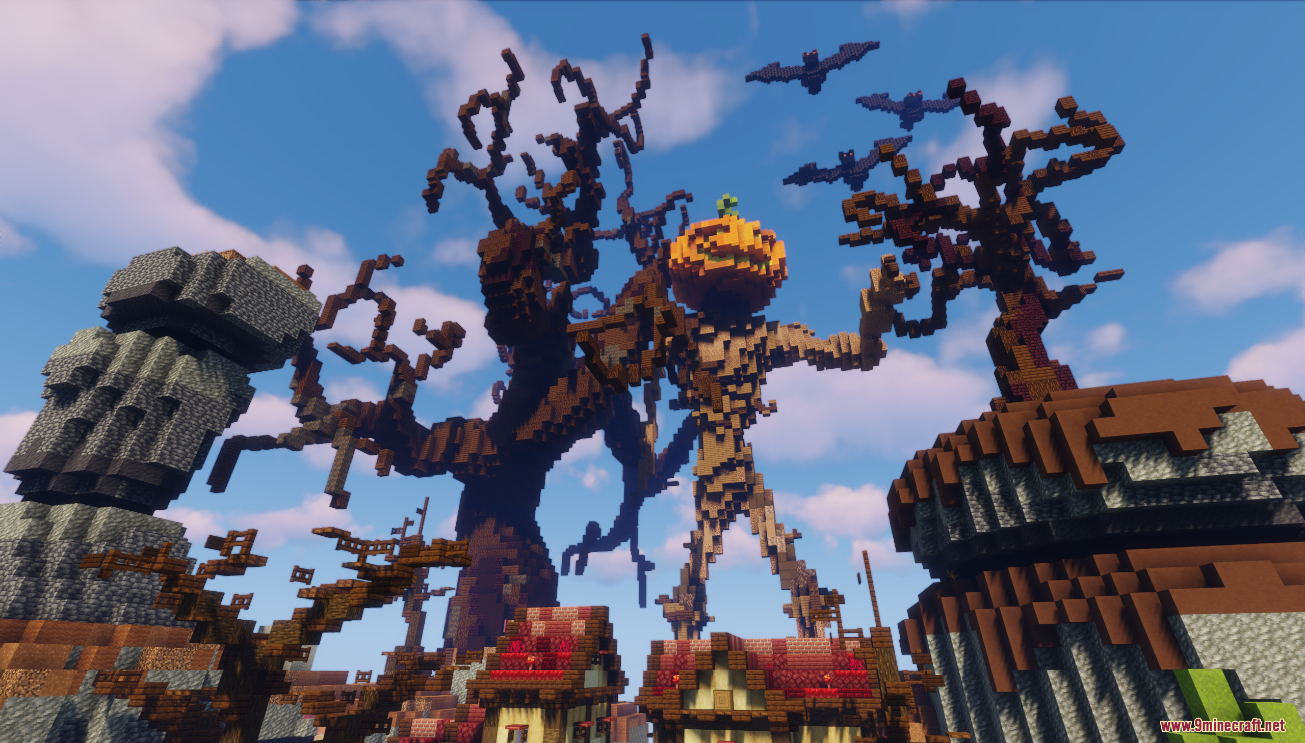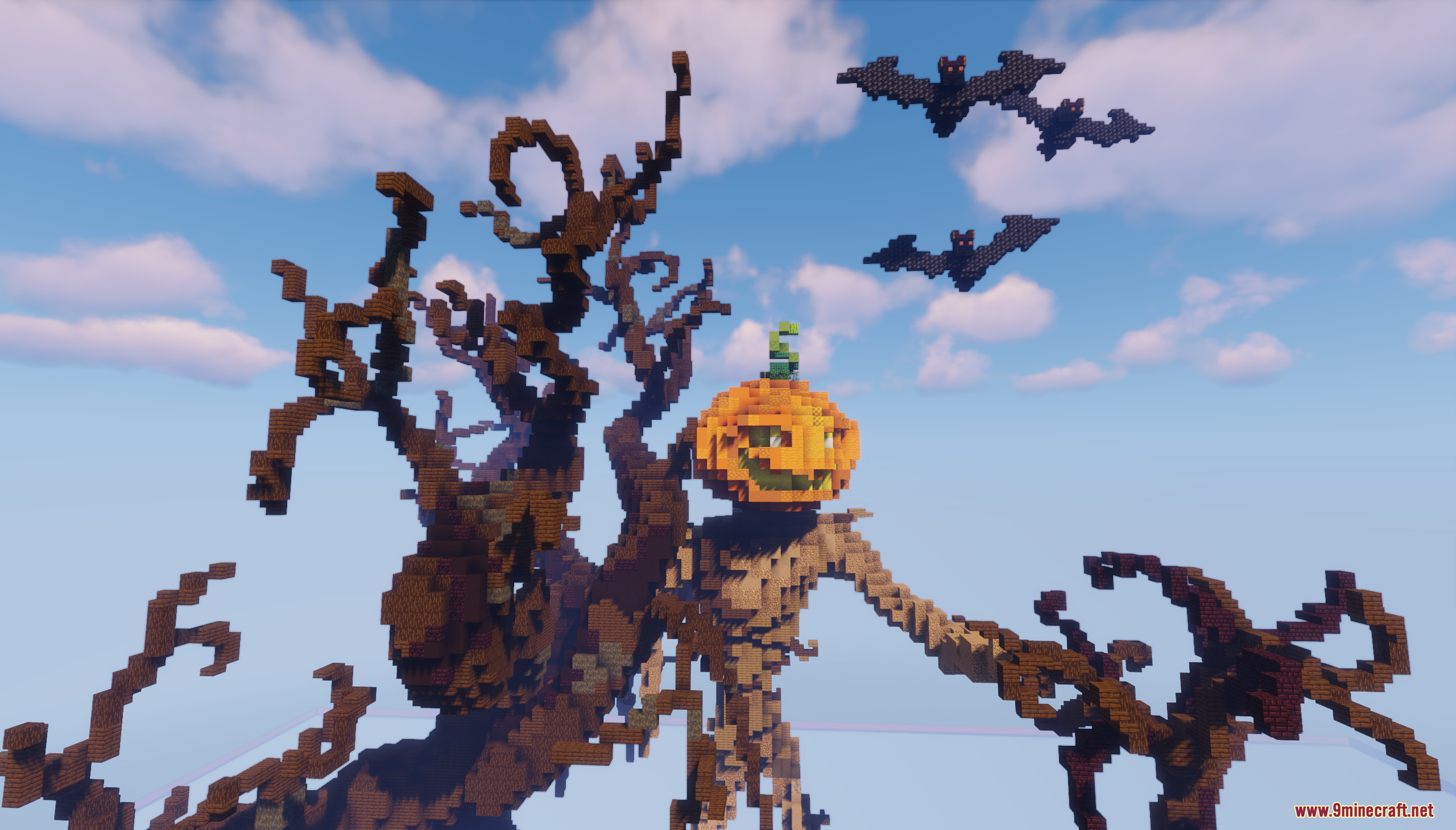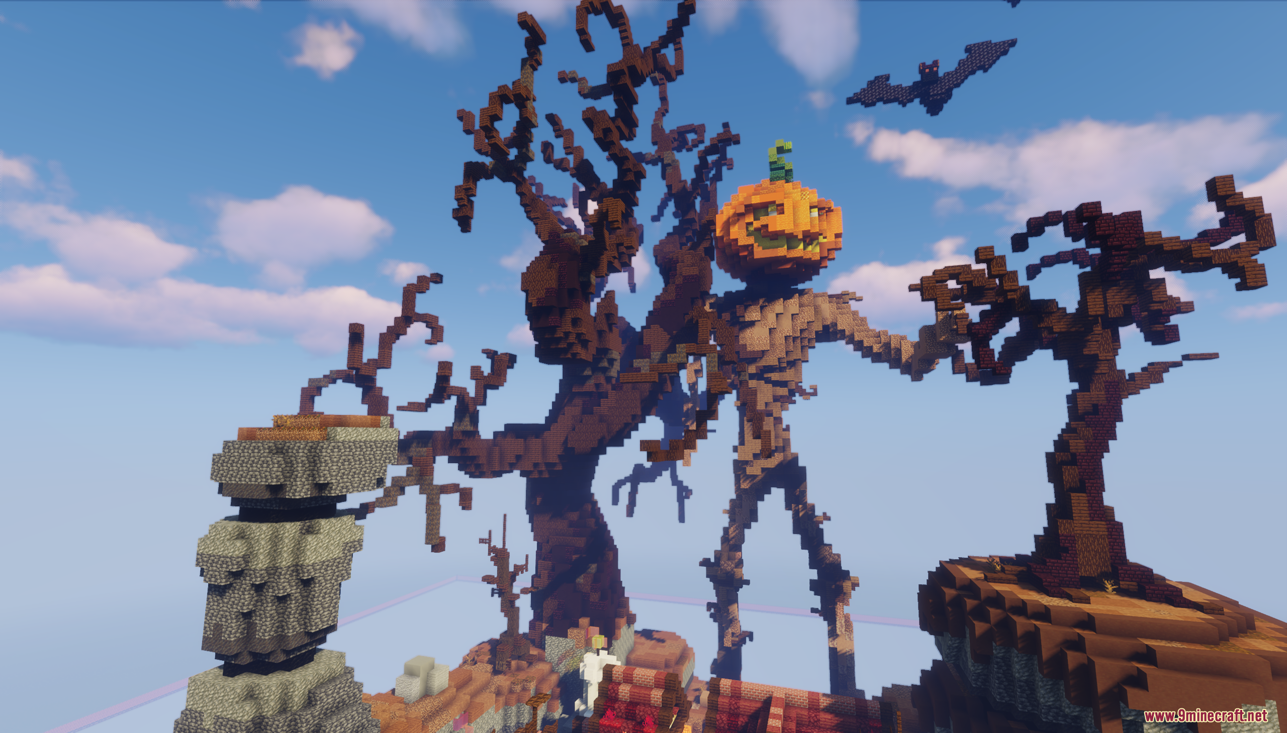 Halloween Spawn Map (1.21.10, 1.20.1) is here to capture the spirit of the spooky season. Floating high above the ground, it features eerie twisted trees, glowing candles, rugged stone formations, and a colossal pumpkin-headed creature towering over the landscape. With detailed custom pumpkins, bats circling the skies, and three designated NPC spots, this map makes a perfect Halloween hub or spawn area for any server looking to enchant players with a chilling yet magical vibe.