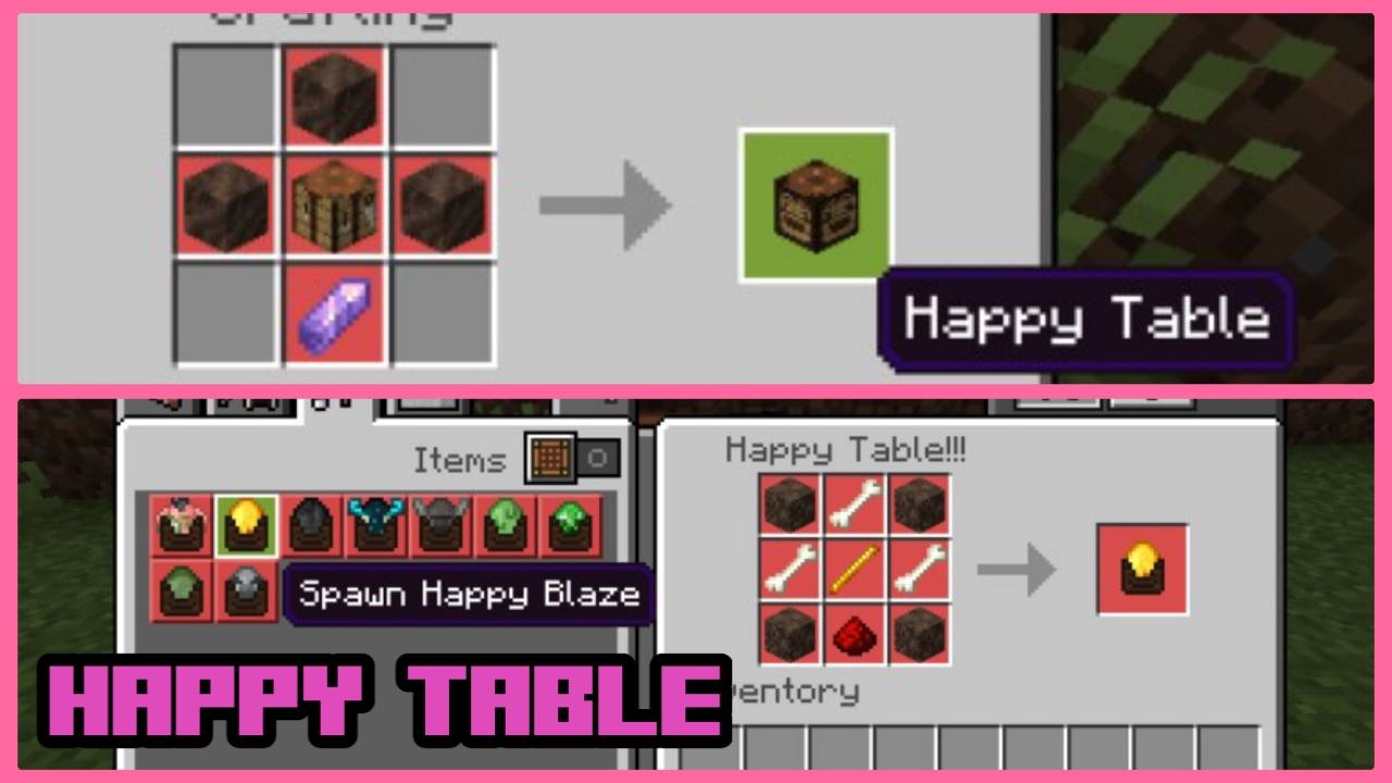 - Happy Table is where you can craft the Happy Mobs. You can craft the happy table with 1 crafting table, 3 soul soil, and 1 amethyst.