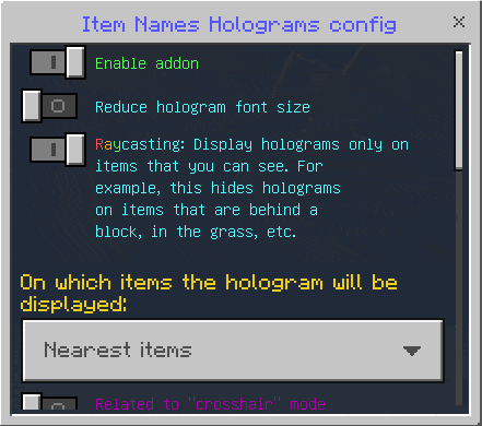 Holograms on Dropped Items Addon displays the name and quantity of dropped items in raised text above the item. The text only appears when the item is within view and not obscured. There are two display modes: visible from close range or visible when centered. Settings allow you to change the color, font size, and limit the amount of text displayed.