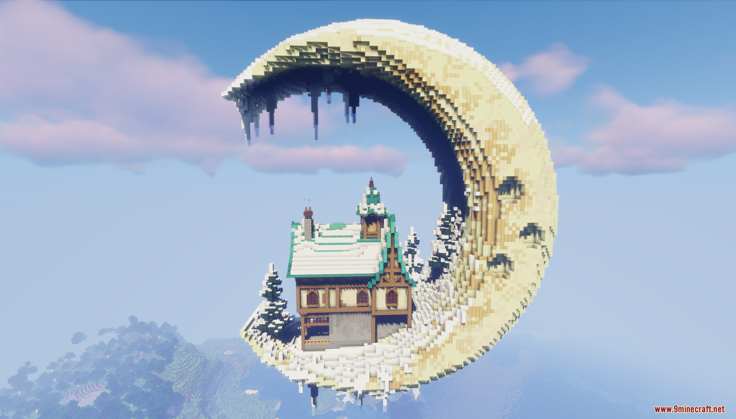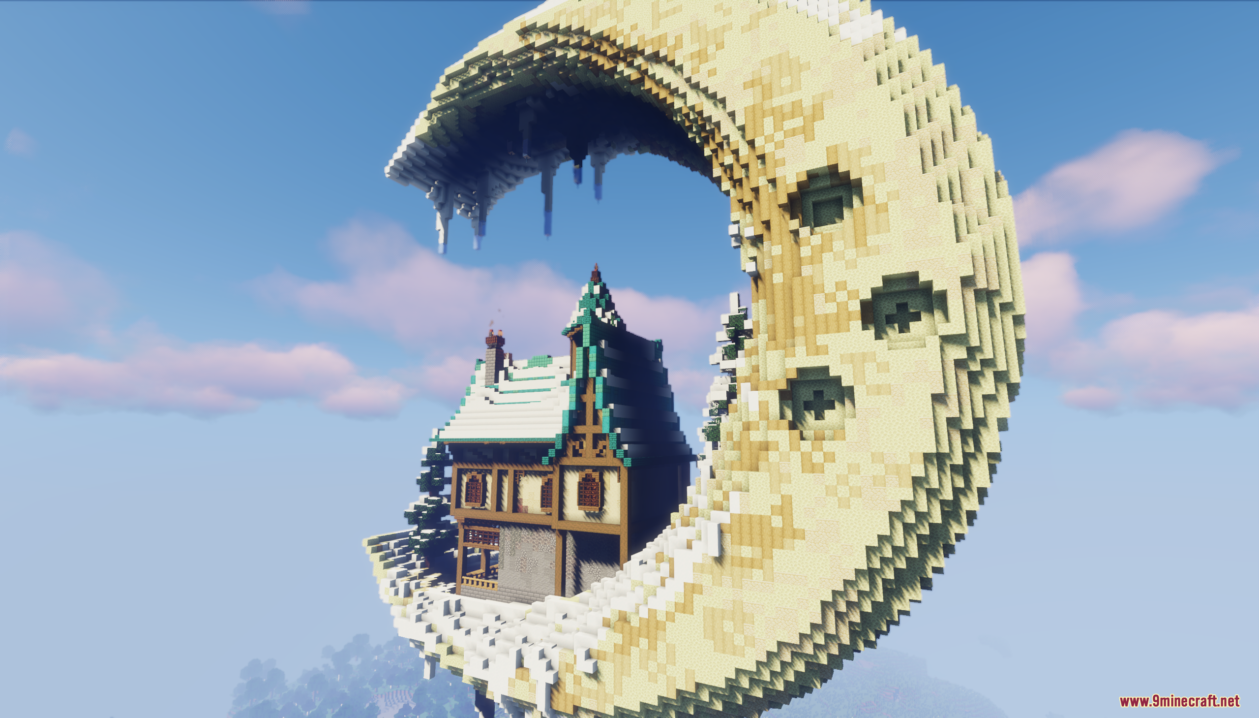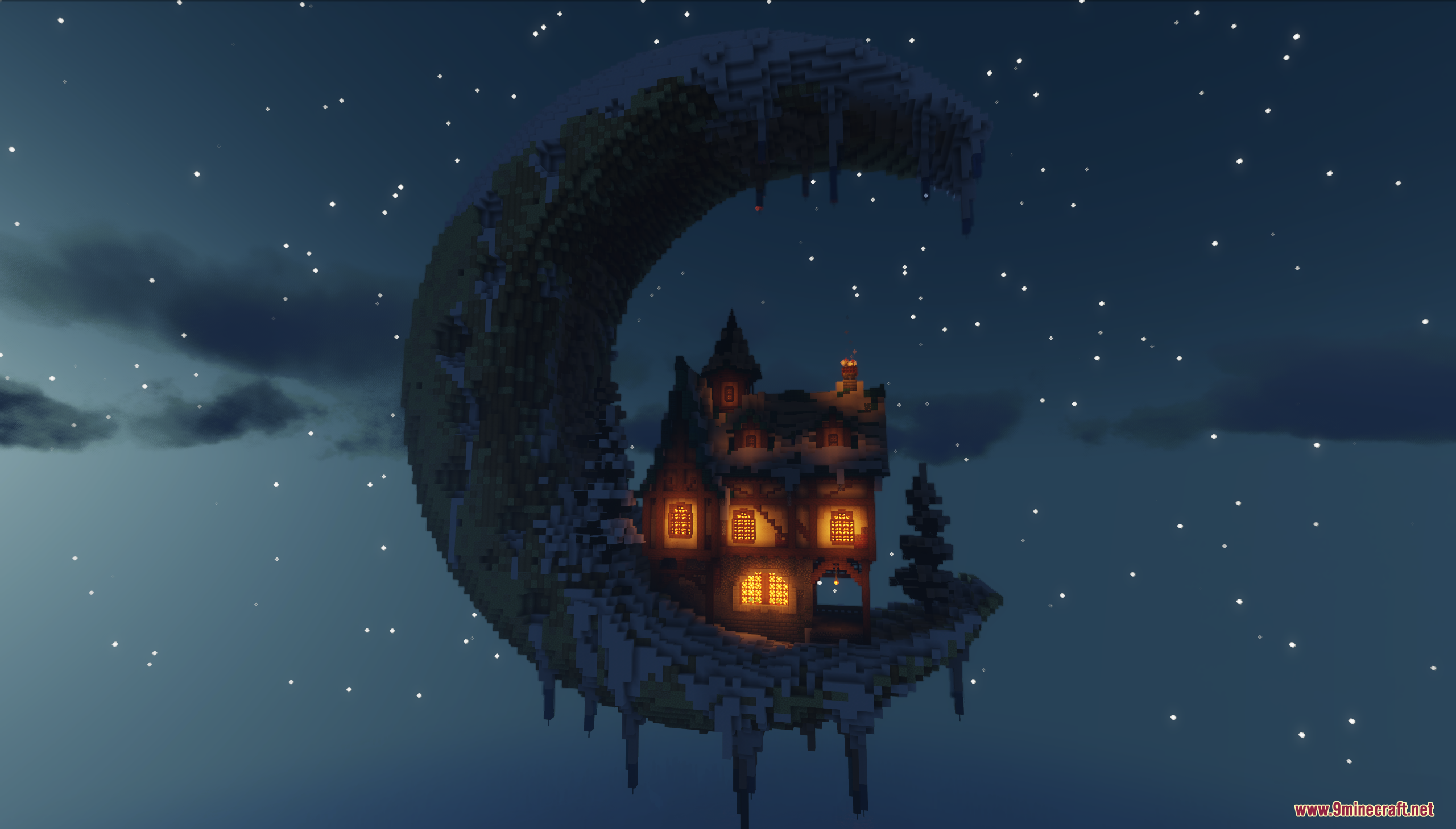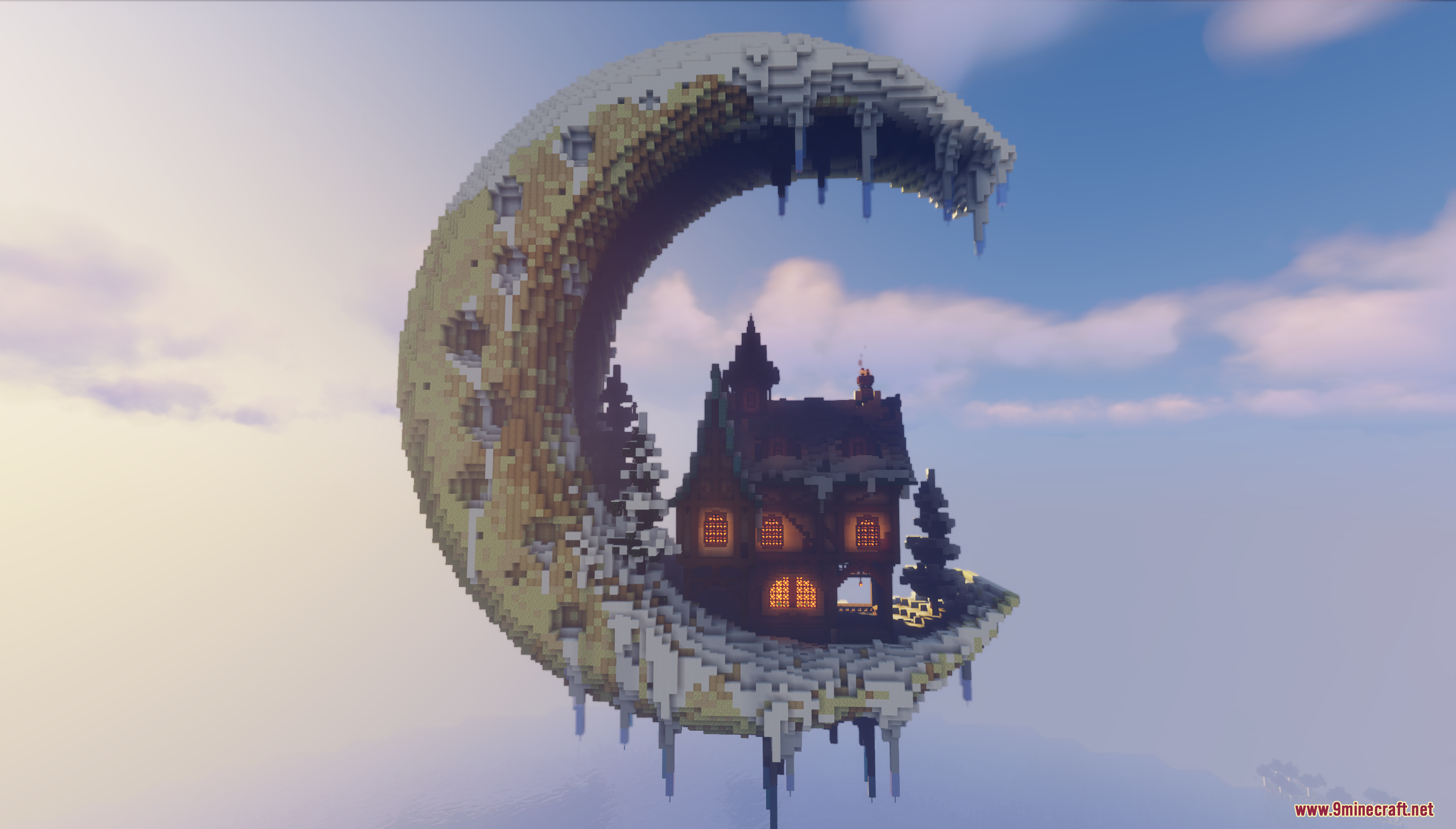 House On The Moon Map (1.21.10, 1.20.1) features a magical floating crescent moon cradling a cozy snow-covered cottage. Suspended high above the clouds, this build blends fantasy and tranquility, making it perfect for peaceful exploration or creative inspiration. With its dreamy atmosphere, glowing icicles, and detailed architecture, it feels like a home for stargazers and dreamers alike — a quiet escape among the stars.