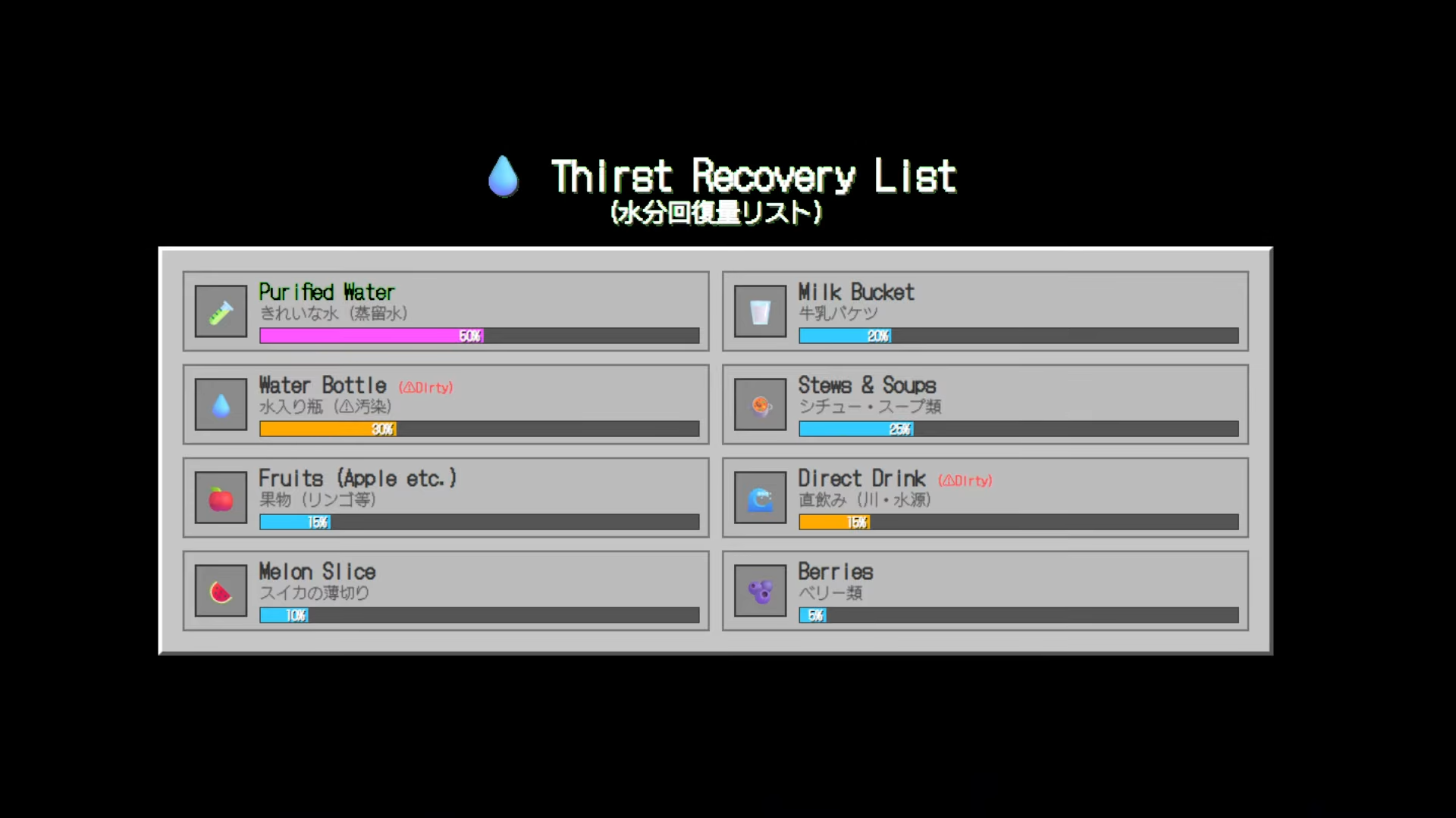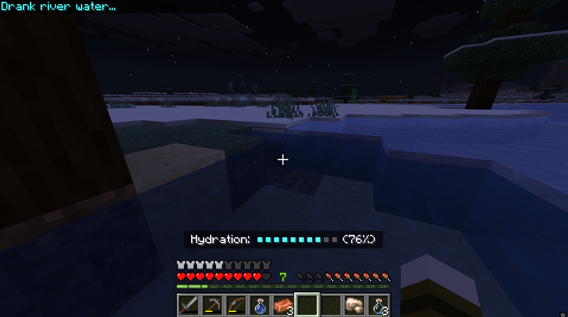Hydration Logic Addon (1.21) adds a thirst mechanism to the survival process. A moisture bar appears above item slots to track the body’s water level. This water level decreases over time and is lost more quickly when running or in Hell. Dehydration causes slow movement, nausea, and continuous blood loss. Drinking water directly from rivers or lakes carries the risk of poisoning if not used with bare hands. Bottled water can be boiled in a furnace to create safe, clean water. Fruits, soups, and milk also help restore the character’s moisture.