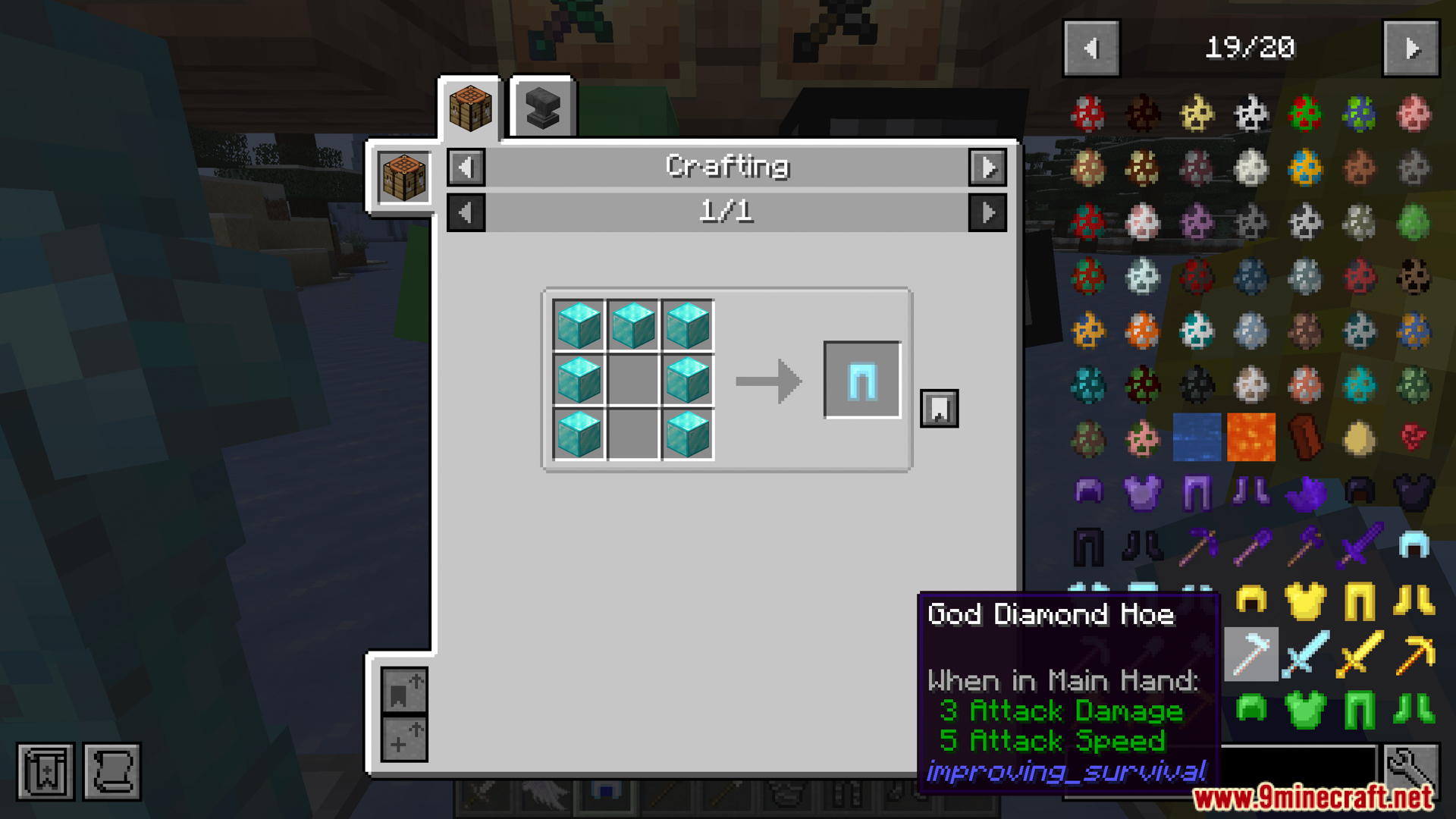 Improving Survival Mod (1.21.1, 1.20.1) adds many new tools, armor sets, and crafting recipes to enhance your survival experience. This mod introduces new materials like emerald, obsidian, quartz, bedrock, and god-tier versions of existing materials. Each material offers different benefits, from infinite durability to special effects like fire resistance and poison immunity. The mod also adds useful items like the Flying Amulet and Invincible Amulet, plus many new crafting recipes for items that are normally hard to get.