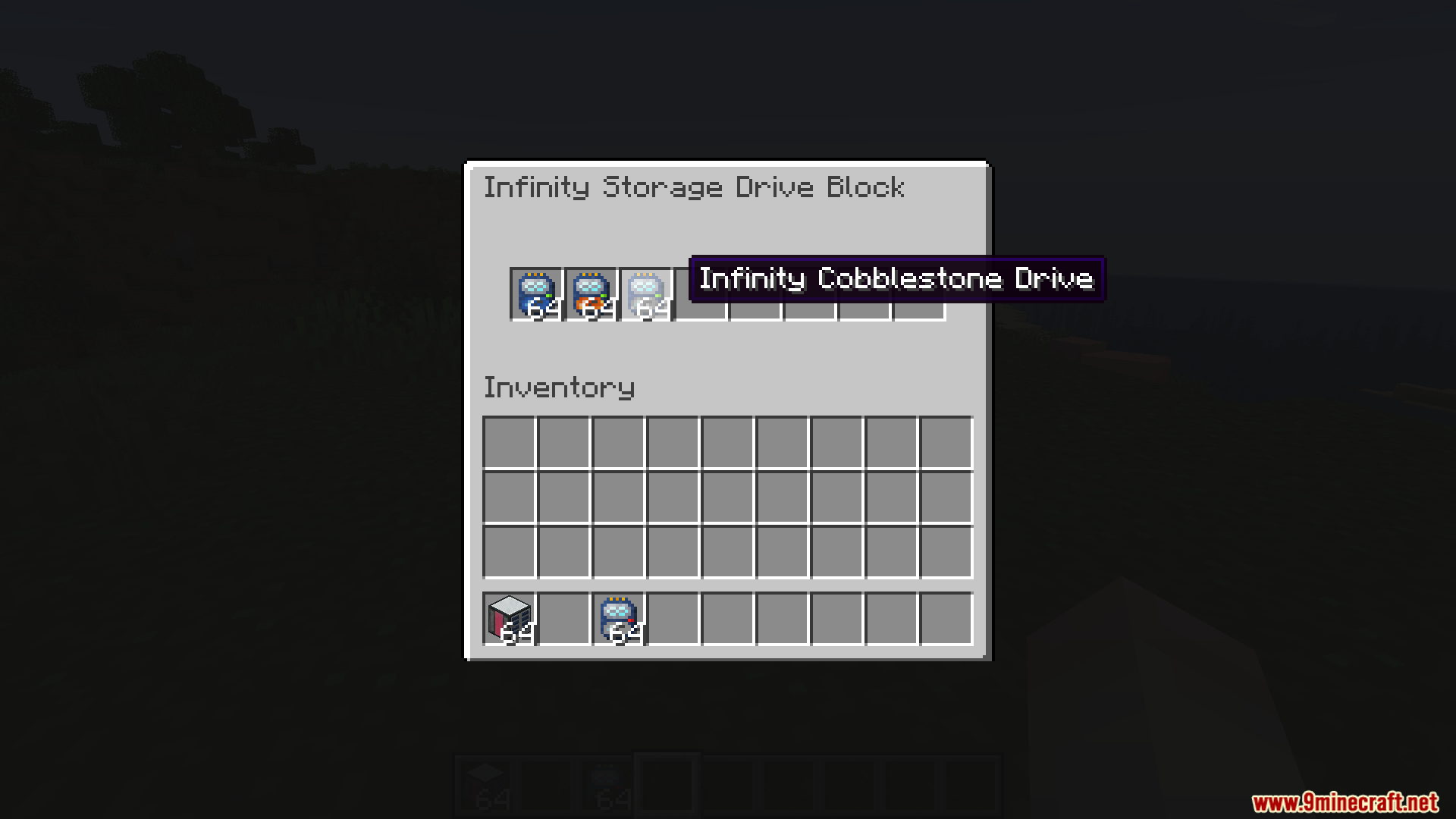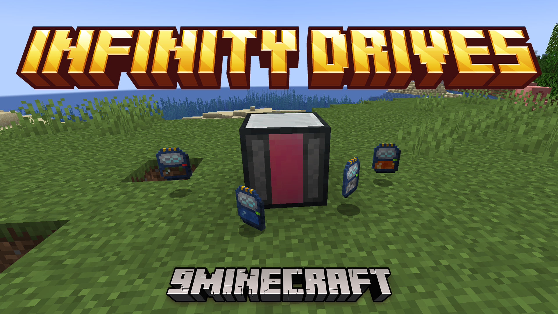 Infinity Drives Mod adds special “drive” items and a single block which, when combined, provide infinite storage of specific resources like water, lava, and cobblestone.