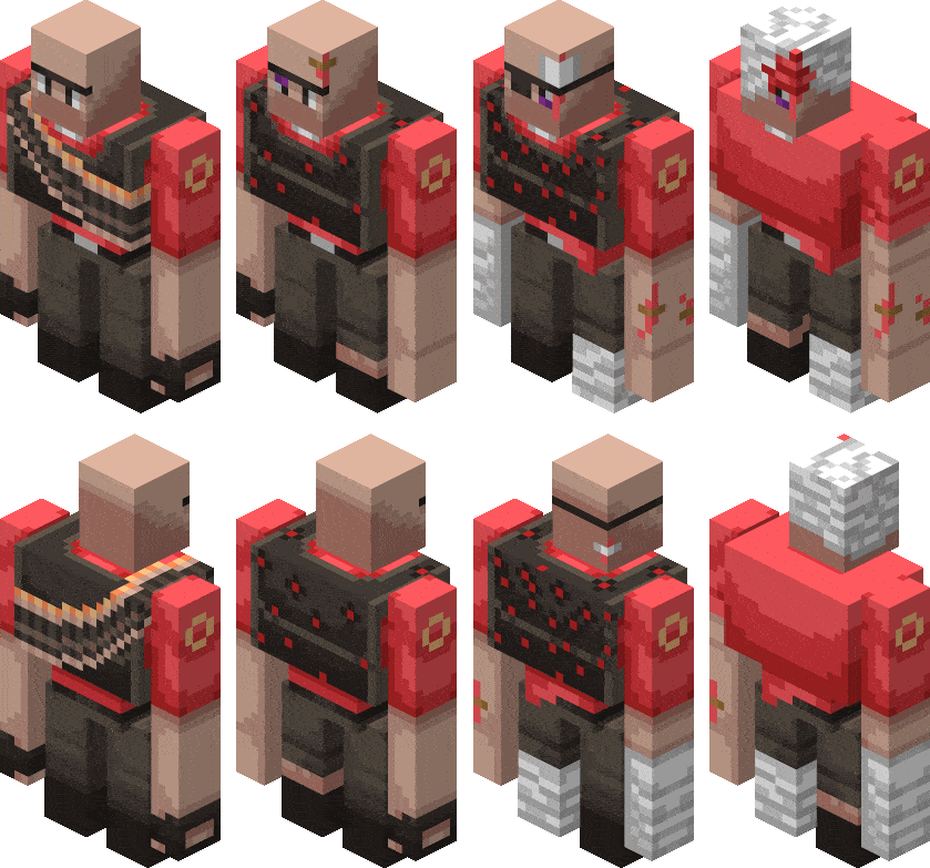 Iron Golem to Heavy Weapons Guy Texture Pack (1.21, 1.20) changes Iron Man’s appearance to the Heavy character from Team Fortress 2. The content includes two color options representing two different teams. Switching between teams is done by tapping the gear icon in the settings. As his health decreases, the character’s appearance will change, showing damage to his clothing, bandages, and a bruised eye instead of the previous cracks in his iron armor.