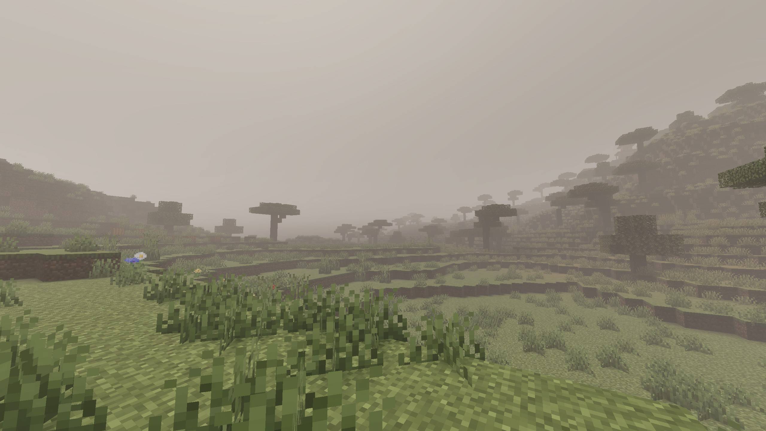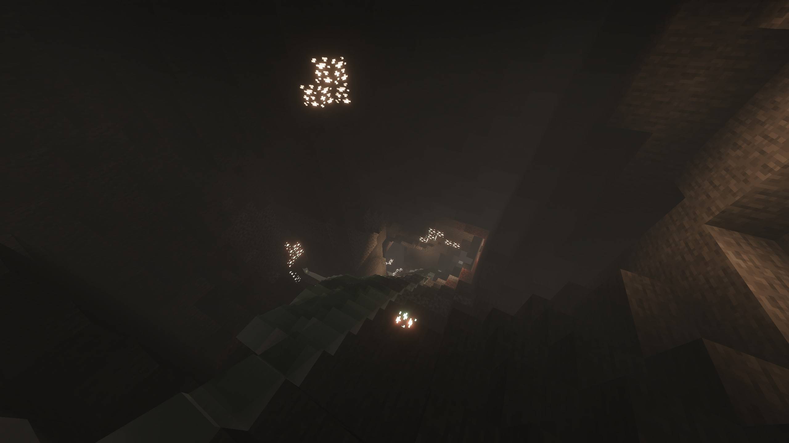 Isak’s Dead Atmospherics Shader (1.21) makes fog appear close to the line of sight and dulls colors. The dark atmosphere supports horror content. Glowing ores are available in this pack. The thickness of the fog changes according to the viewing distance settings.