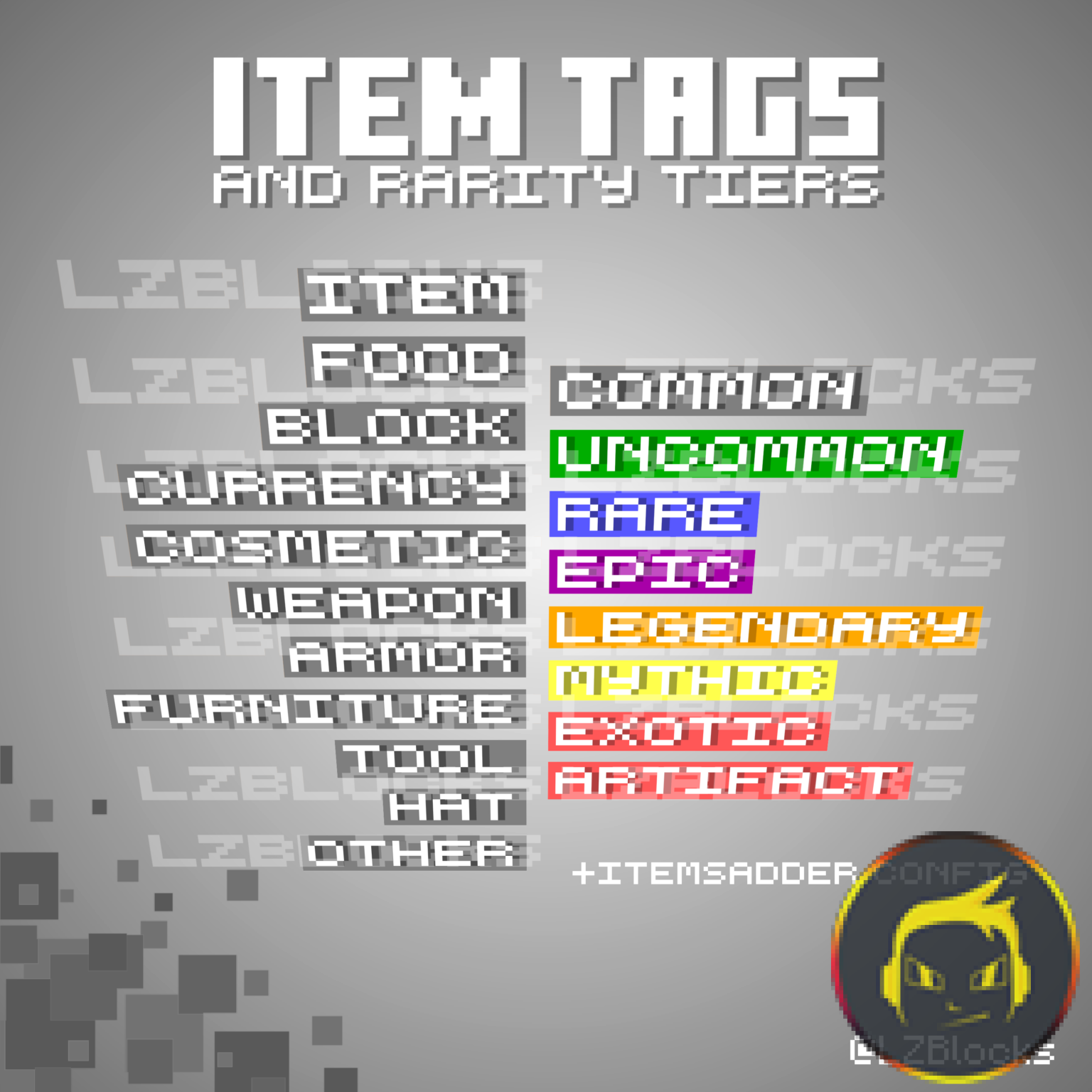 Item Tags And Rarity Tiers Model includes 19 unique tags and rarity tiers, just like in Fortnite, Borderlands, The Division, Dota 2, and almost all of our other favorite games. With the included ItemsAdder drag and drop configuration, you don’t have to configure tags yourself.