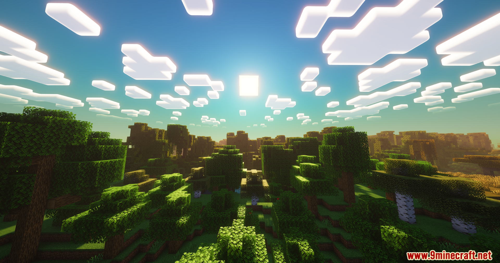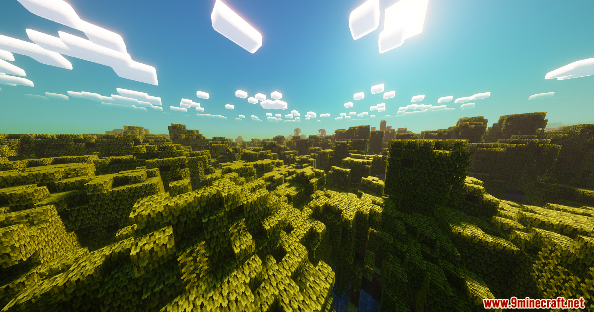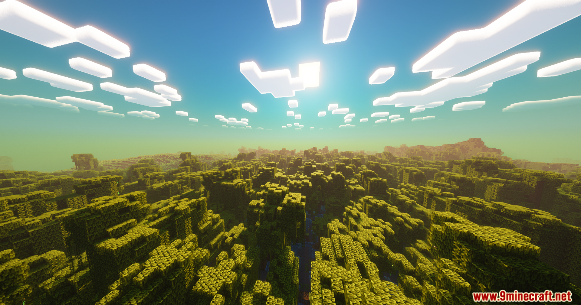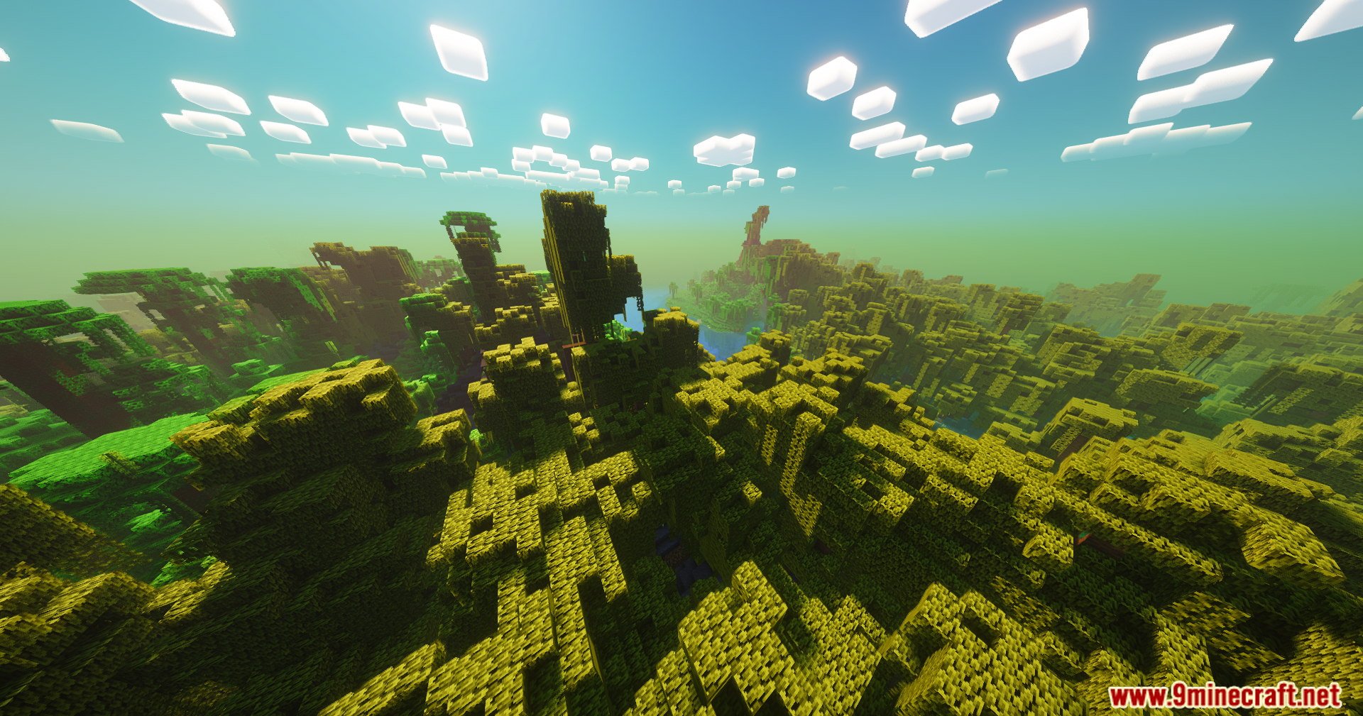 Jooonah’s Grove Shaders (1.21.11, 1.20.1) focuses on a green-themed visual style, applying a distinct green tone across the sky and overall world rendering.