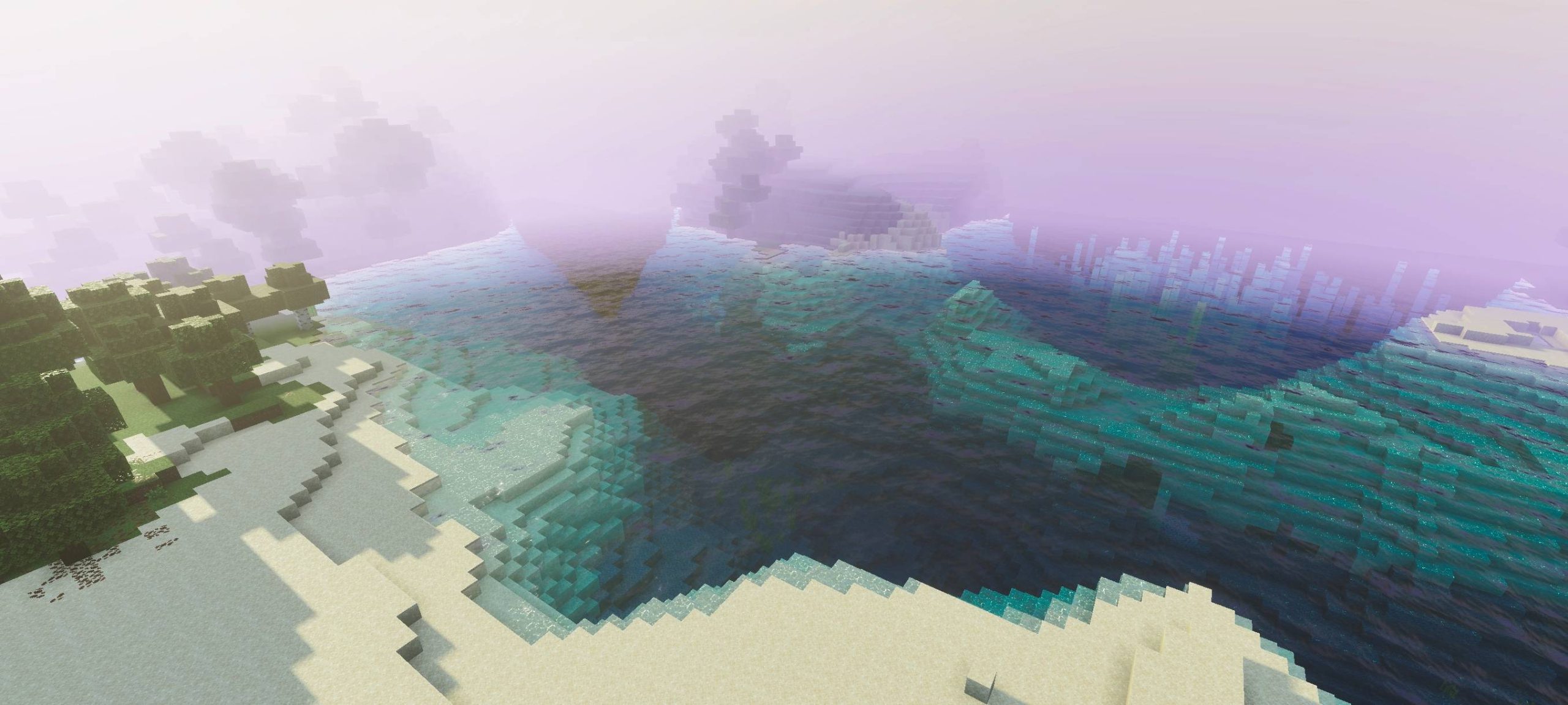 Karen Visual Shader (26.1) alters images by adding purple hues and a beautiful sunrise effect. These changes create a more fantastical and dynamic viewing experience. The purple light gives the scene a different appearance compared to the original.