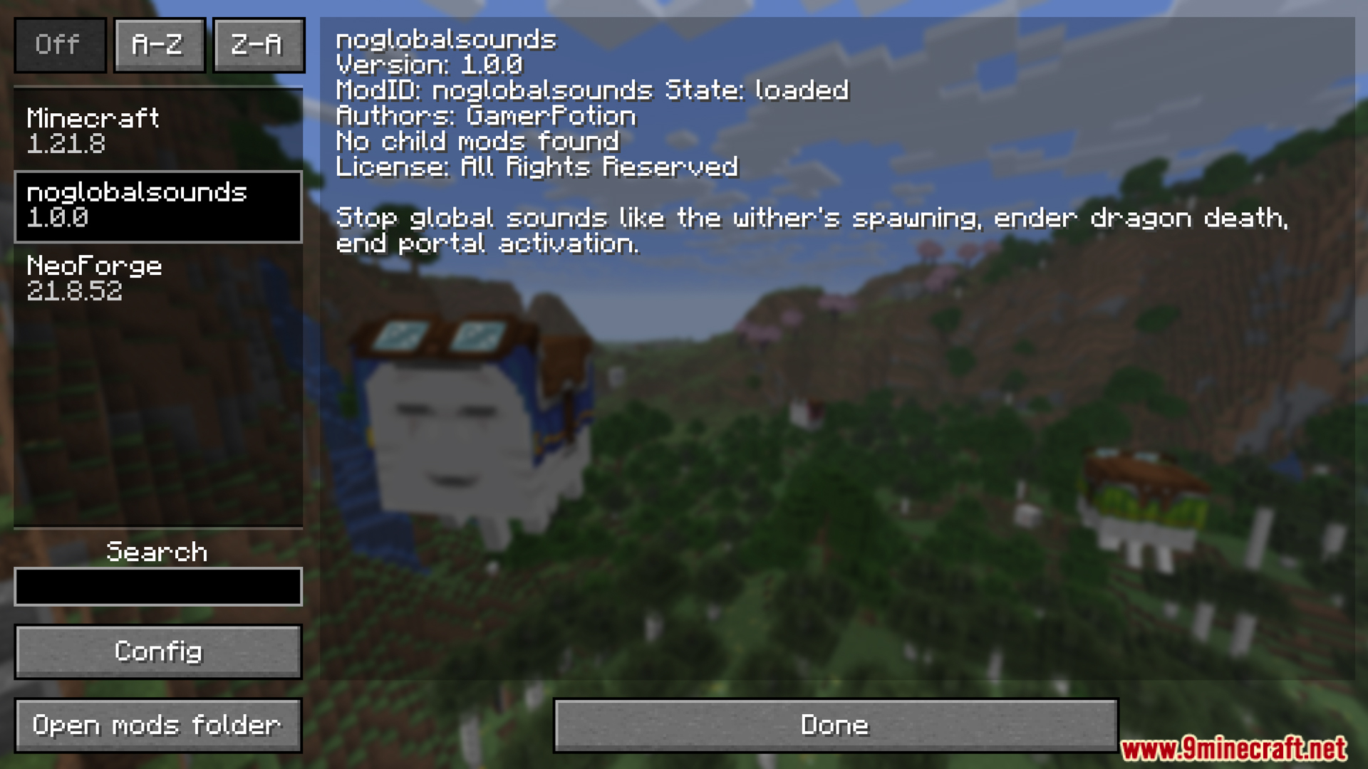 Lazyboys No Global Sounds Mod (1.21.11, 1.20.1) is a simple mod that automatically sets the global sound gamerule to false every time the game or server loads. This stops global sounds like the Wither’s spawning noise, Ender Dragon death roar, and End portal activation from being heard by all players in the world. These sounds normally play for everyone regardless of distance, which can be disruptive on multiplayer servers.