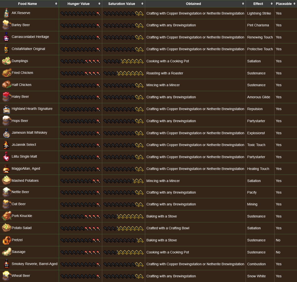 - Smokey Reverie, Barrel-Aged — Hunger: 2, Saturation: 4, Obtained: Crafting with Copper or Netherite Brewingstation, Effect: Combustion, Placeable: Yes