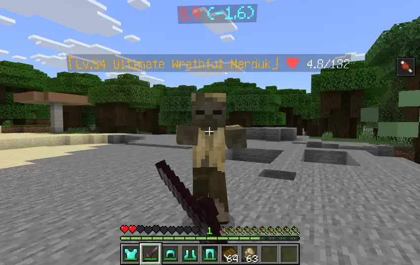 Levelled Mobs and Legendary Loot Addon (1.26, 1.21) features an on-screen health and damage display system. Monsters have a chance of appearing as Bosses with tiers including Elite, Lord, and Hero. Defeating Bosses yields equipment, gems, and skill books. Combat companions are summoned using summoning items and upgraded with experience packs.
