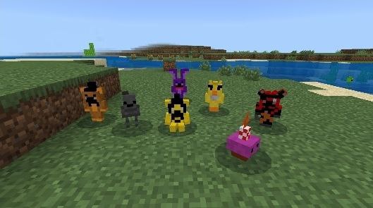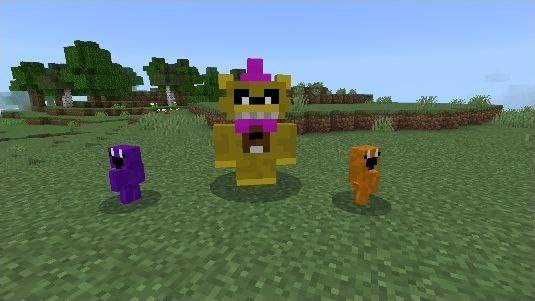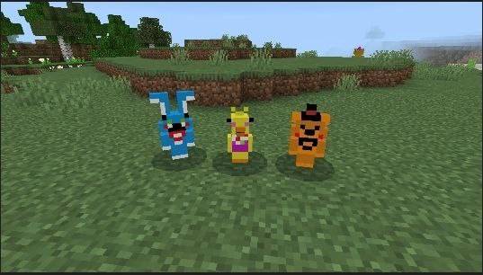 Lil Fnaf Addon (v26, 1.21) adds 35 types of robots to the game. These entities can be tamed or crafted using specific items. Some appear randomly when exploring areas. The robot list includes groups from Part 1, the movie version, and yellow versions.