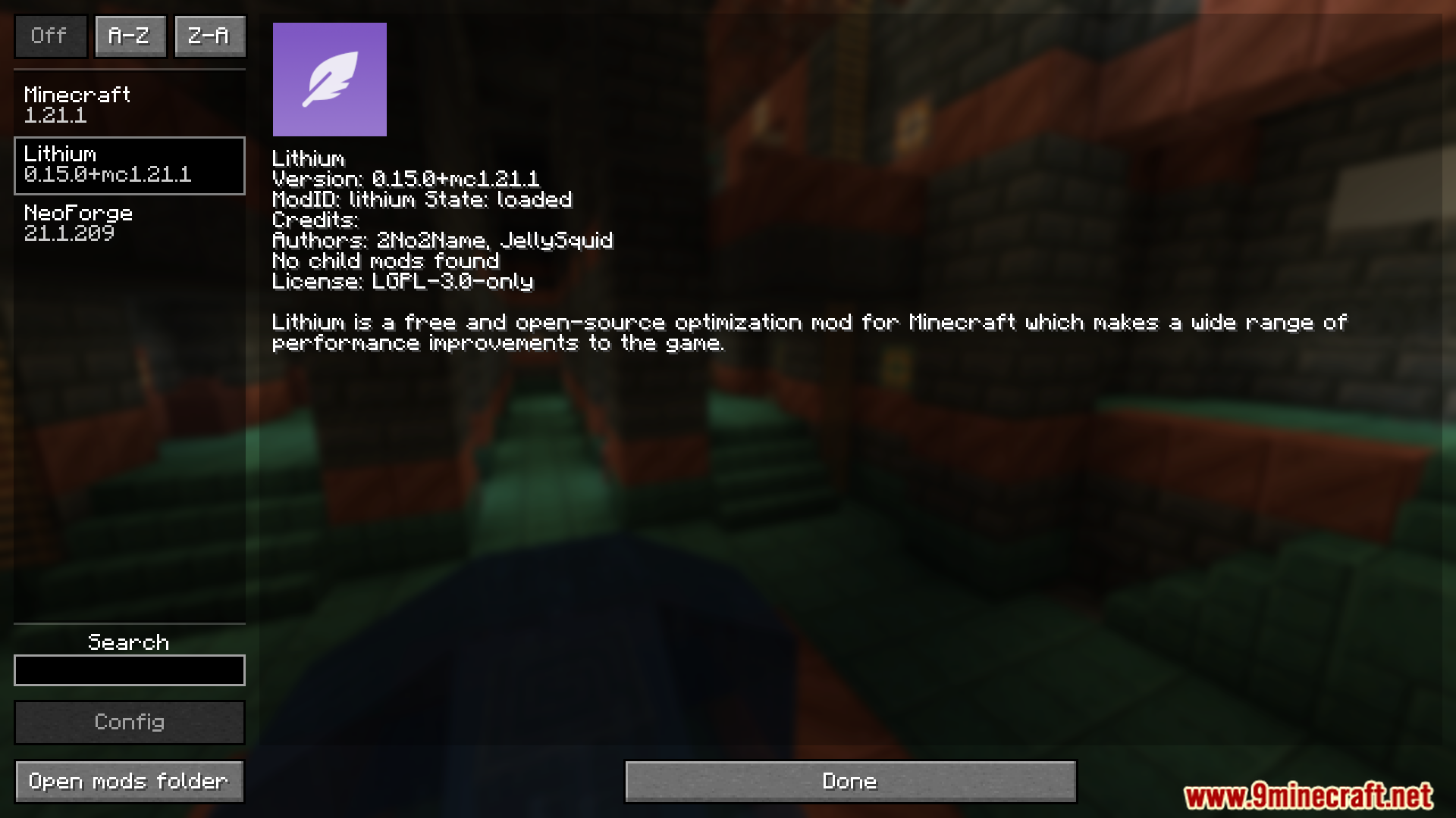 Lithium Mod (1.21.10, 1.20.1) is an optimization mod that reduces load and increases FPS in Minecraft. It is a universal mod that improves both game and server performance and can function for players as well as on servers. It allows for up to a 45% reduction in CPU load. The mod optimizes several areas, including physics calculations, mob AI, chunk loading, mob farms, and redstone circuits. It also comes with its own configuration file that enables users to disable optimizations for specific game aspects, ensuring better compatibility with other mods. Let me know if you’d like further assistance!