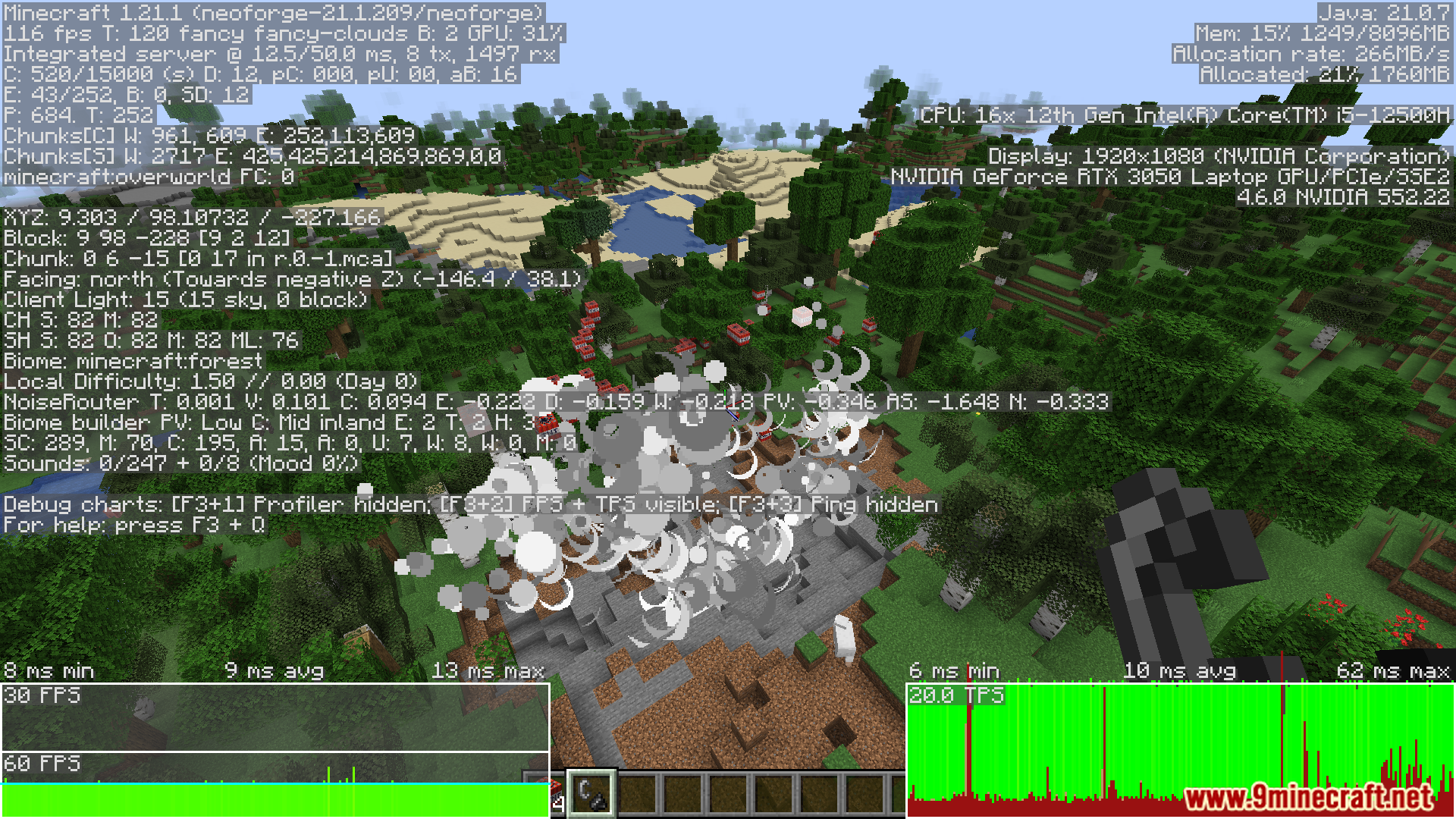 - Explosion optimizations: Many optimizations have been applied to TNT and explosions alike, reducing their associated lag without changing how they behave. In particular, ray-tracing is optimized to take advantage of the fact that multiple steps through a way will occur in the same block position, allowing us to quickly re-use the previous step’s results. We also make use of a faster position tracking algorithm which avoids many excessive allocations.