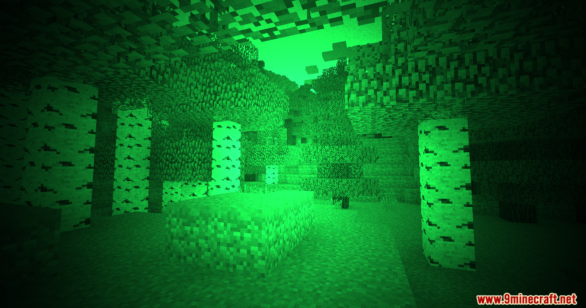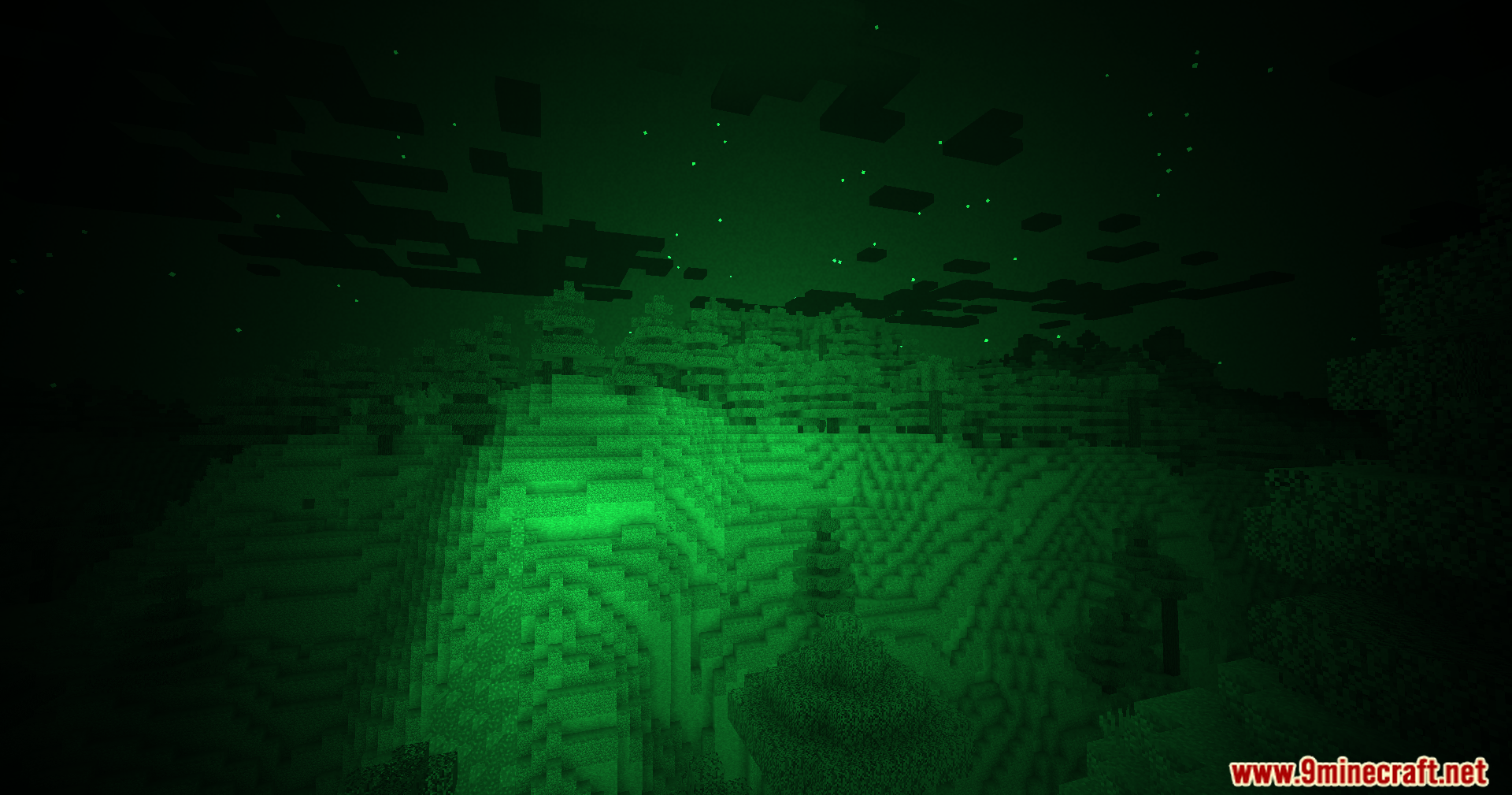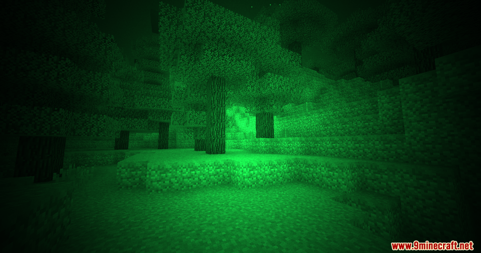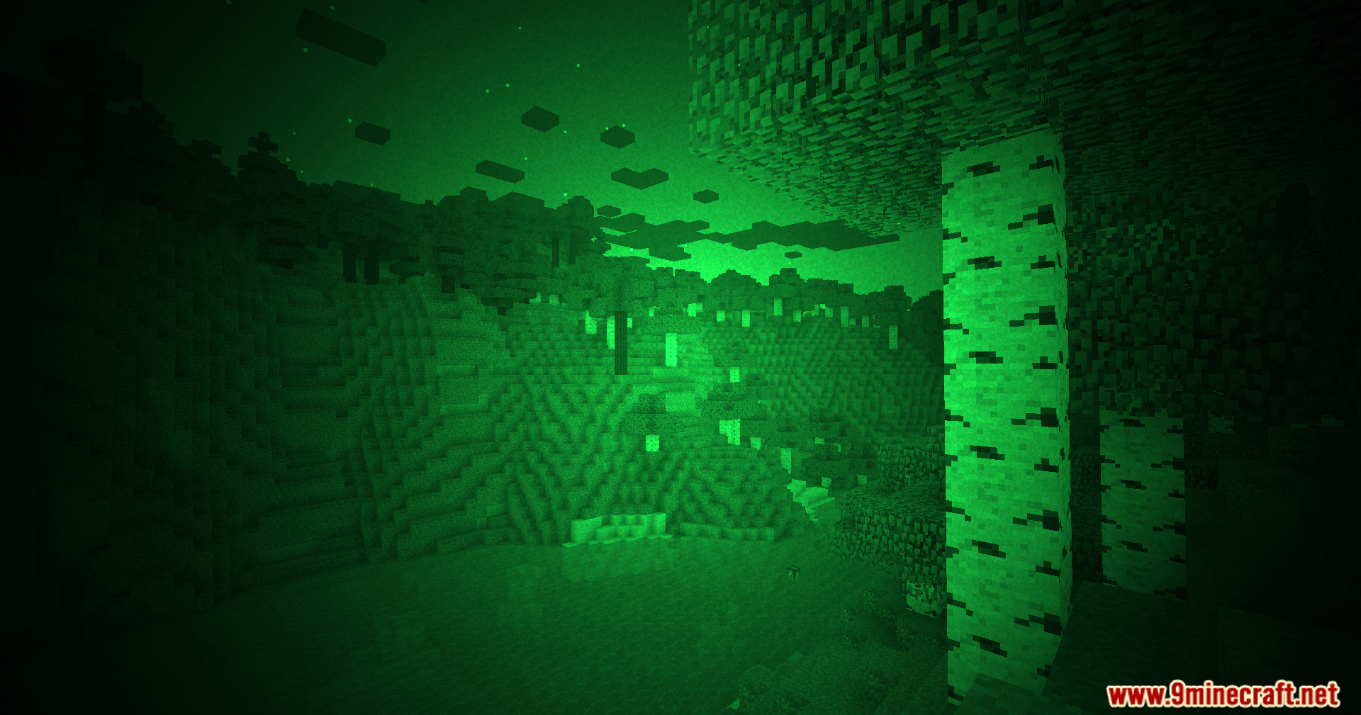 Loé’s Night Vision Shaders (1.21.11, 1.20.1) changes how the world is rendered by applying visual effects commonly associated with night vision devices, such as noise, color filtering, exposure adjustment, and lens effects.