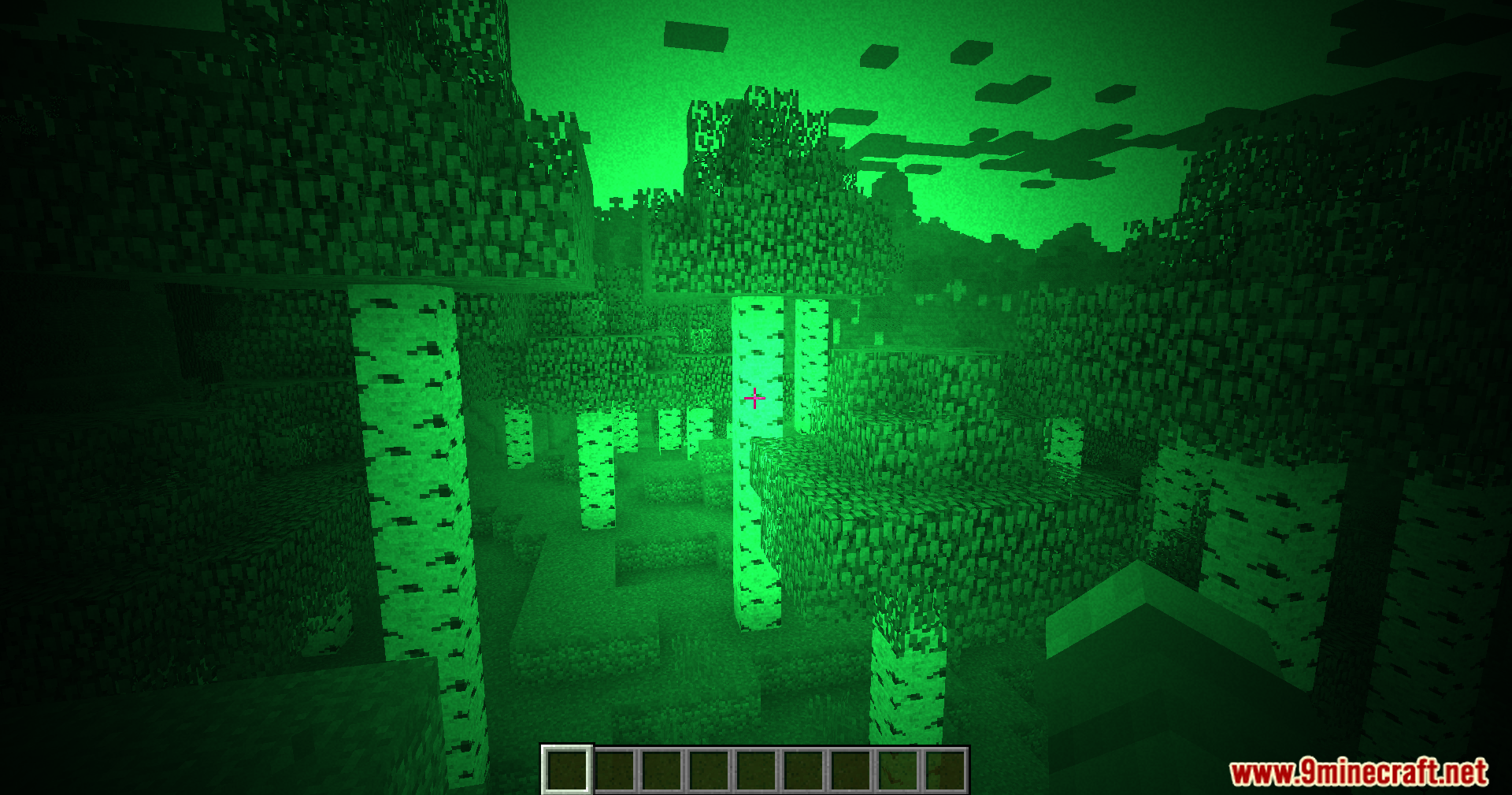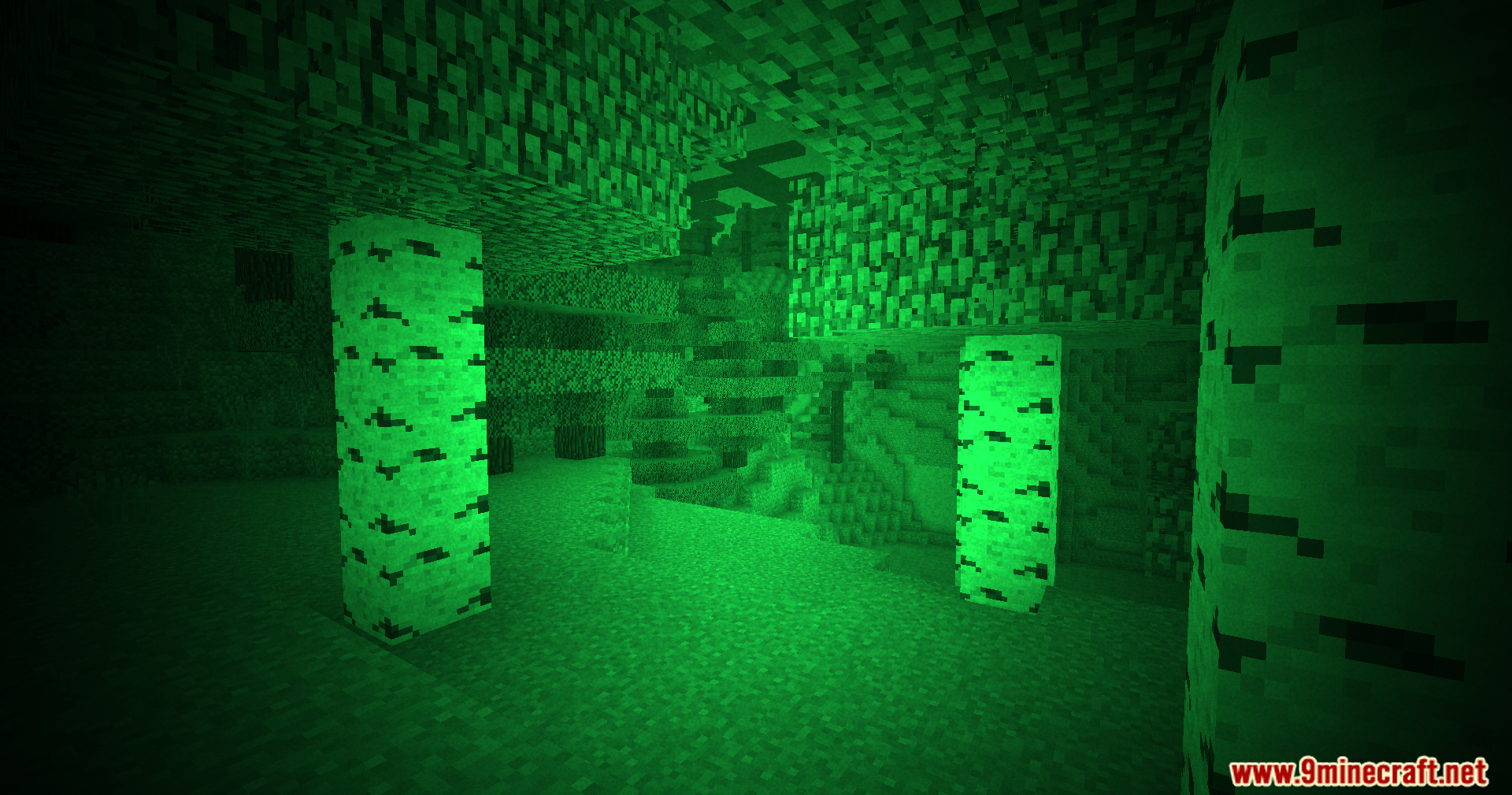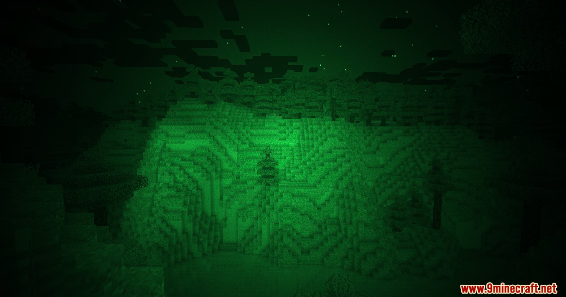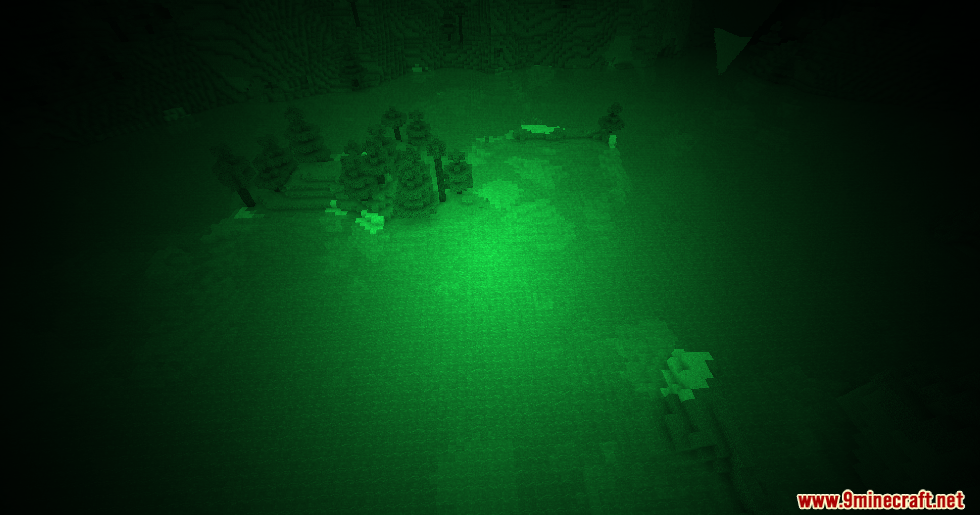 Loé’s Night Vision Shaders (1.21.11, 1.20.1) changes how the world is rendered by applying visual effects commonly associated with night vision devices, such as noise, color filtering, exposure adjustment, and lens effects.