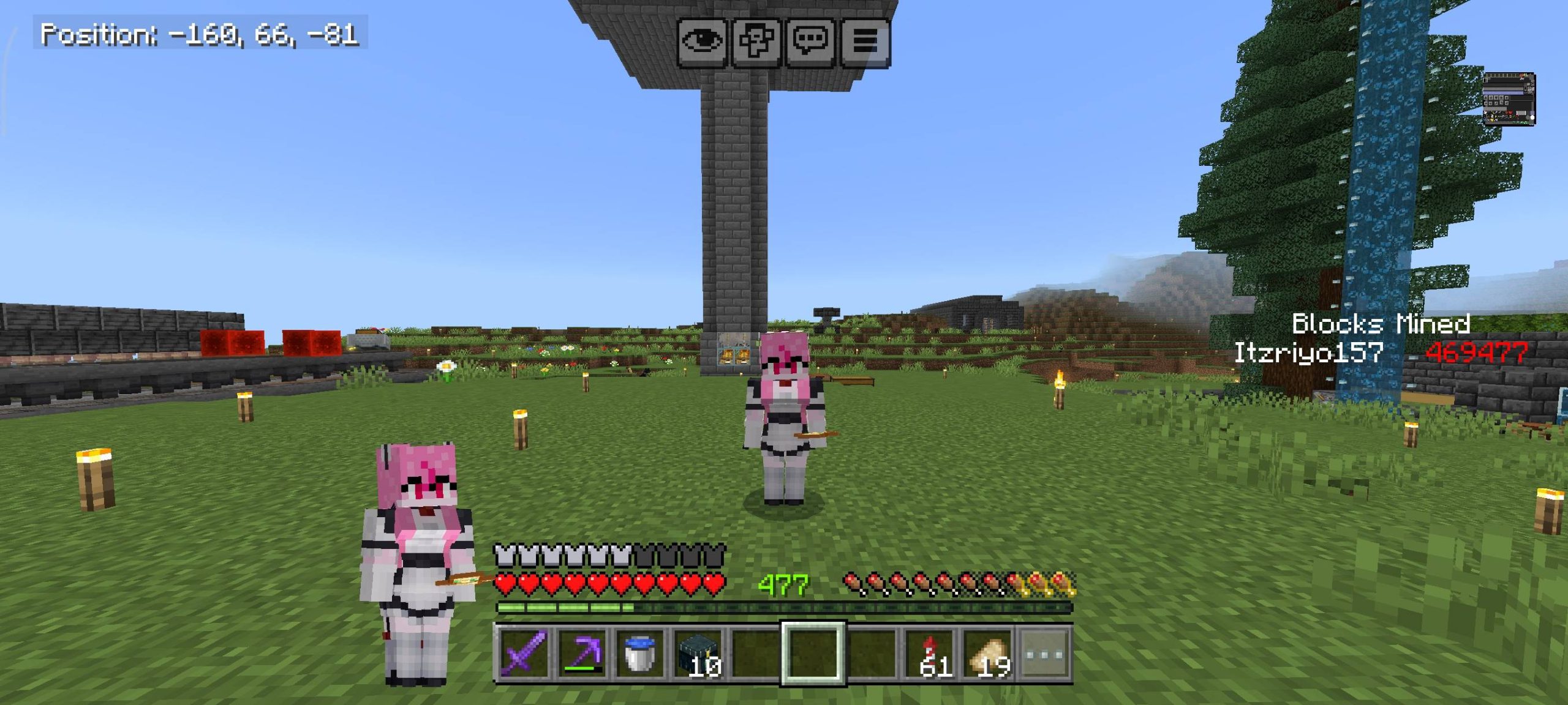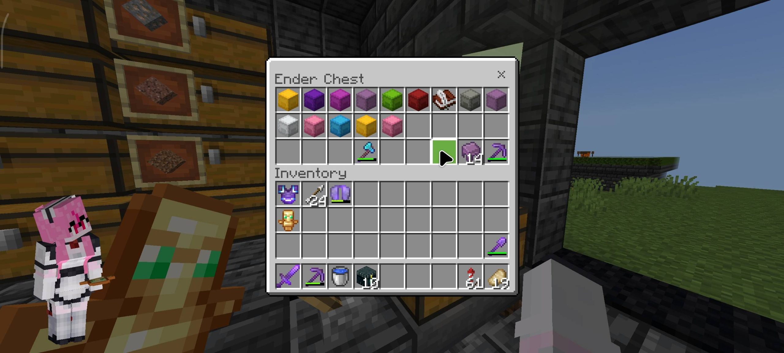 Look at My Skin Texture Pack (1.21, 1.20) adds a small character image to the main screen, inventory, and crafting board. This image helps observe the character while moving or check the armor being worn. There are two options for use: a dynamic animation style or a fixed display style.
