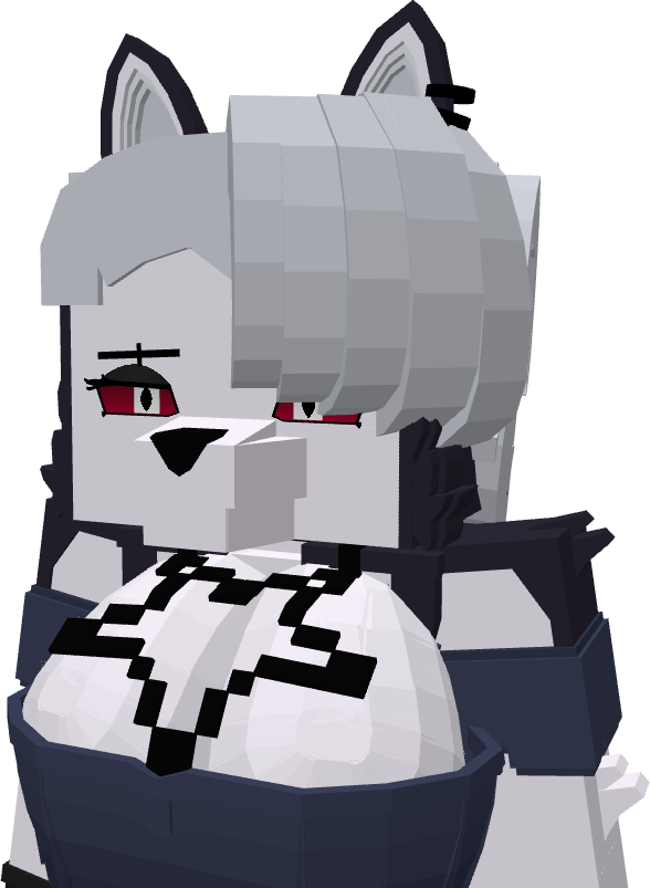 Loona For Ellie Jenny Mod Model features a fox with light gray fur, pointed ears, and short gray hair that partially covers one eye. They have red eyes and a calm, slightly serious expression. The character is wearing a dark outfit with a white chest area featuring a black cross-like pattern, and dark shoulder armor or sleeves.