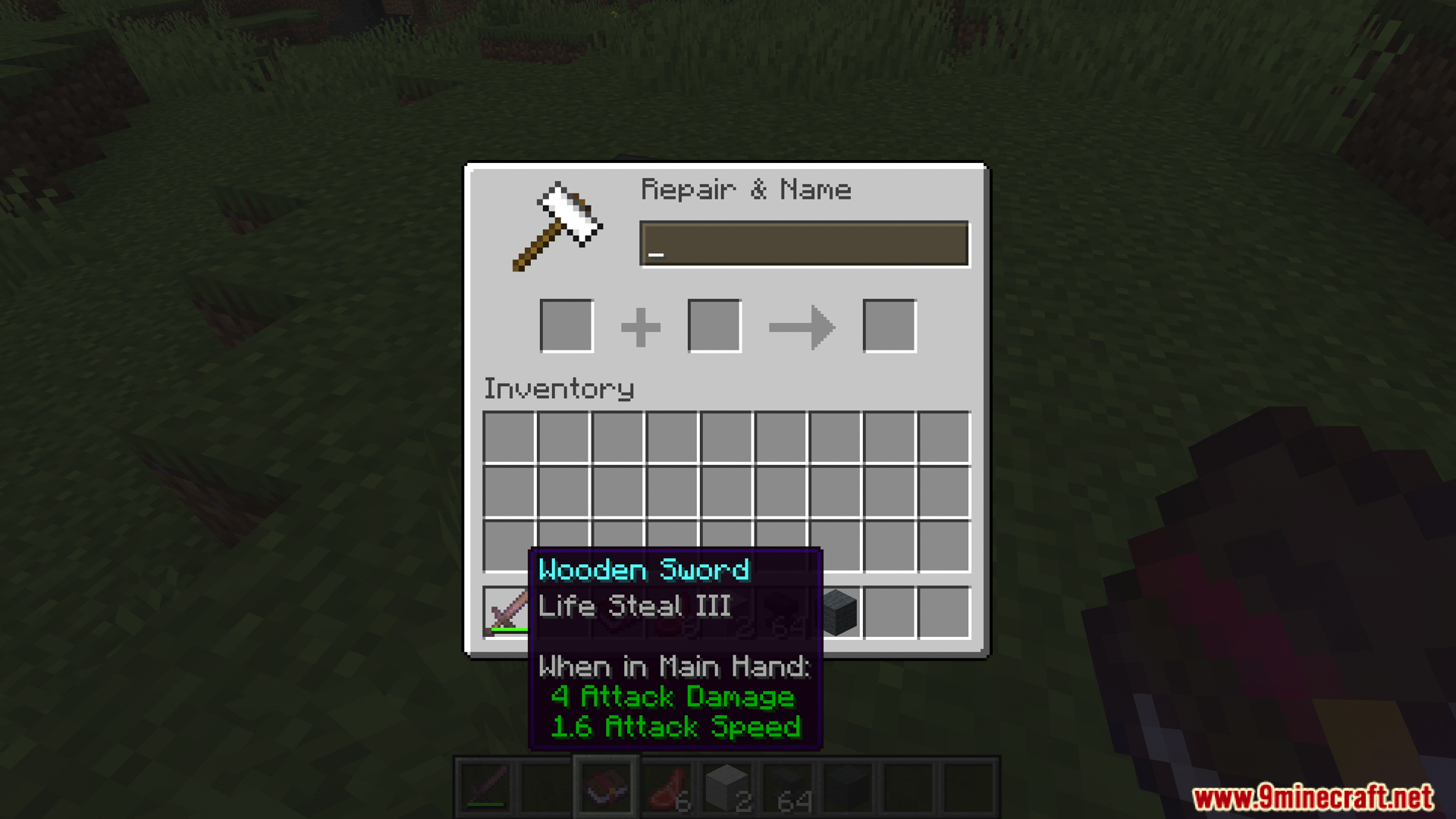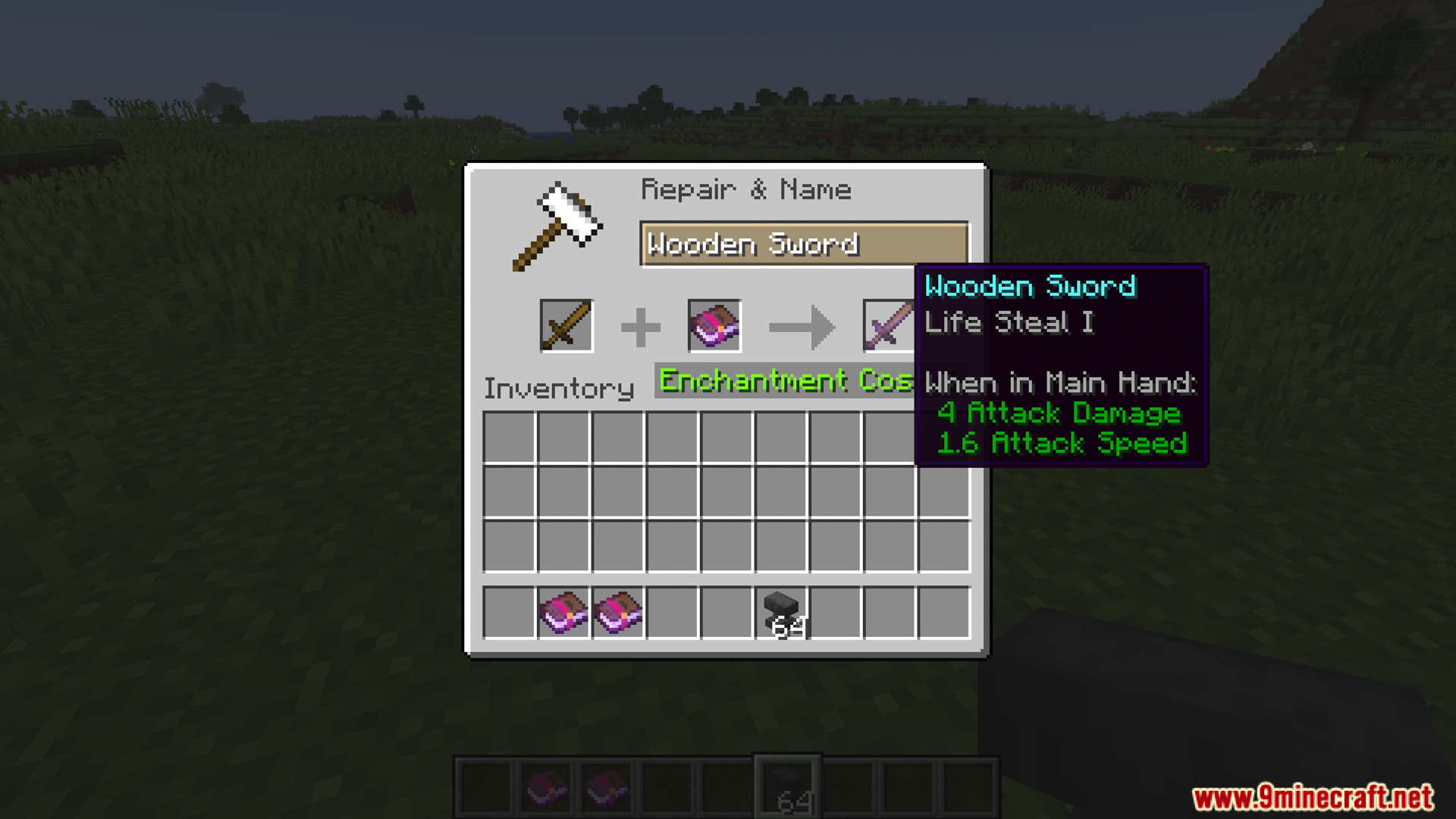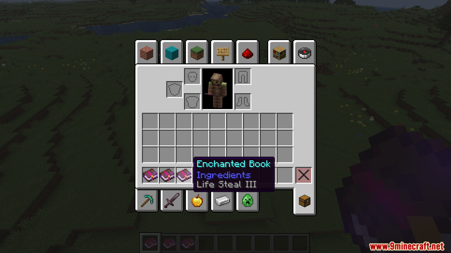 lullaby6 Life Steal Enchantment Mod (1.21.11, 1.21.1) adds a new weapon enchantment called Life Steal with 3 levels. Each level reduces the amount of damage you need to deal in order to steal life from the target. The enchantment can be obtained through the enchantment table, loot chests, or villager trading.