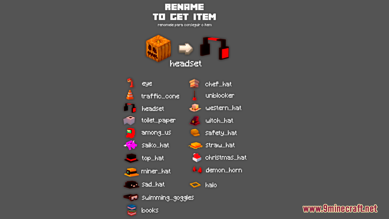 Many Hats Resource Pack (1.21.10, 1.20.1) is a playful and lightweight 16 × resource pack that lets you customize your character’s headgear with 20 fun and unique hats – from pop-culture references like Among Us, traffic cones, chef’s hats, horns, halos, and more. To use a hat, you rename a carved pumpkin in an anvil to the specific hat name (e.g., “traffic_cone”, “chef_hat”), then wear it, and the texture pack transforms the pumpkin into the chosen hat. With no gameplay changes and just visual flair, it’s perfect for players wanting to inject personality, humor, or style into their avatar while keeping the vanilla feel.