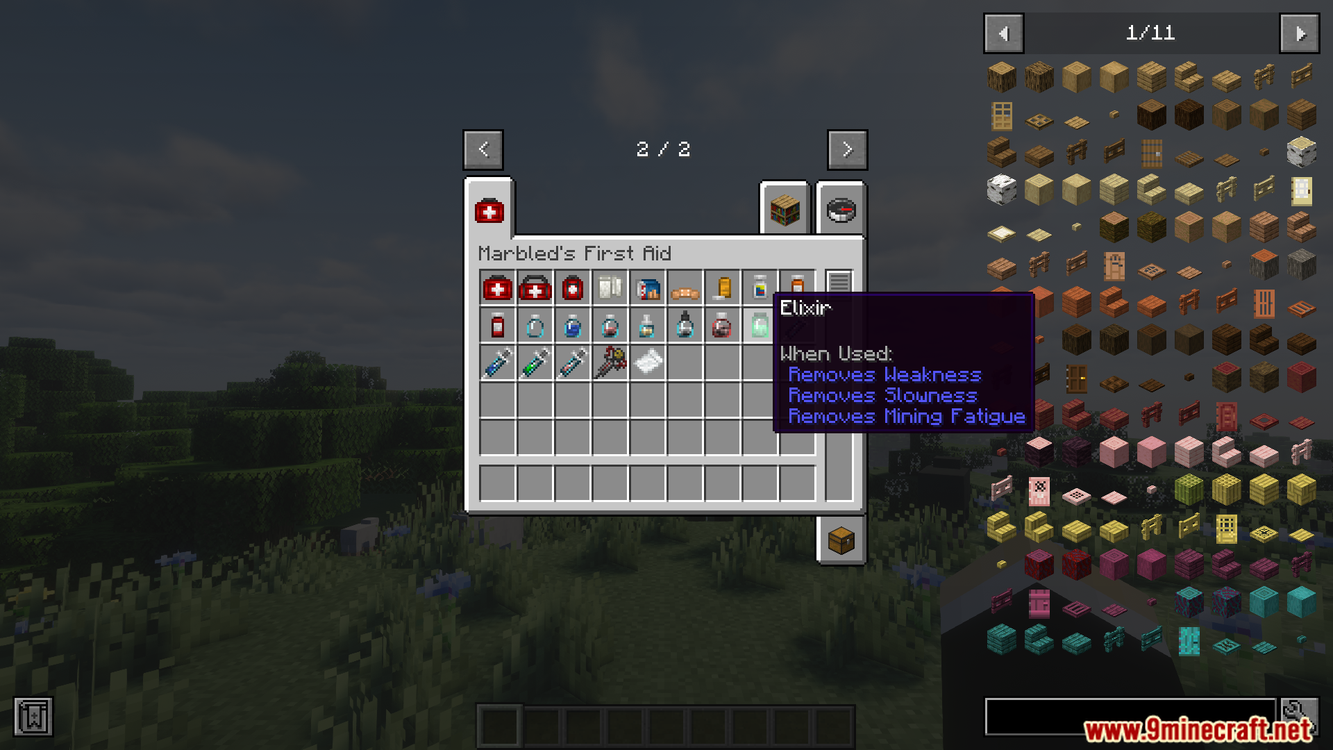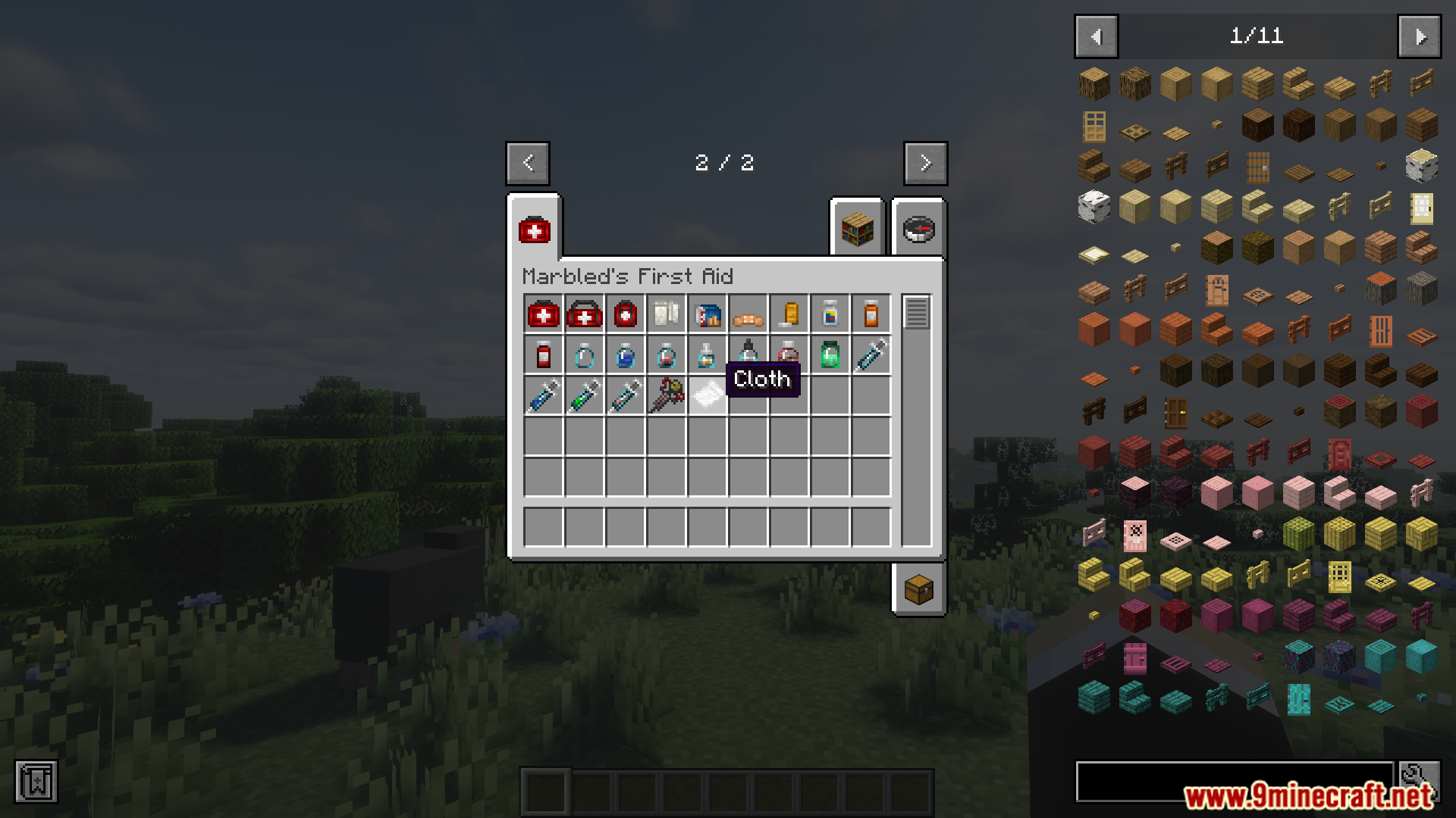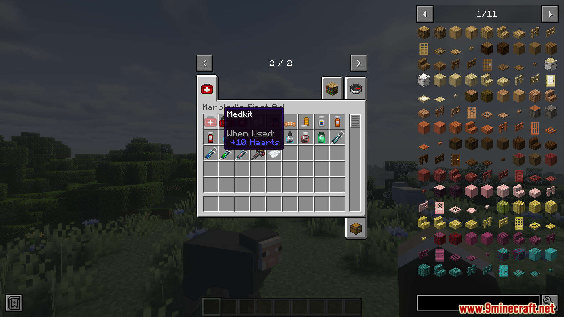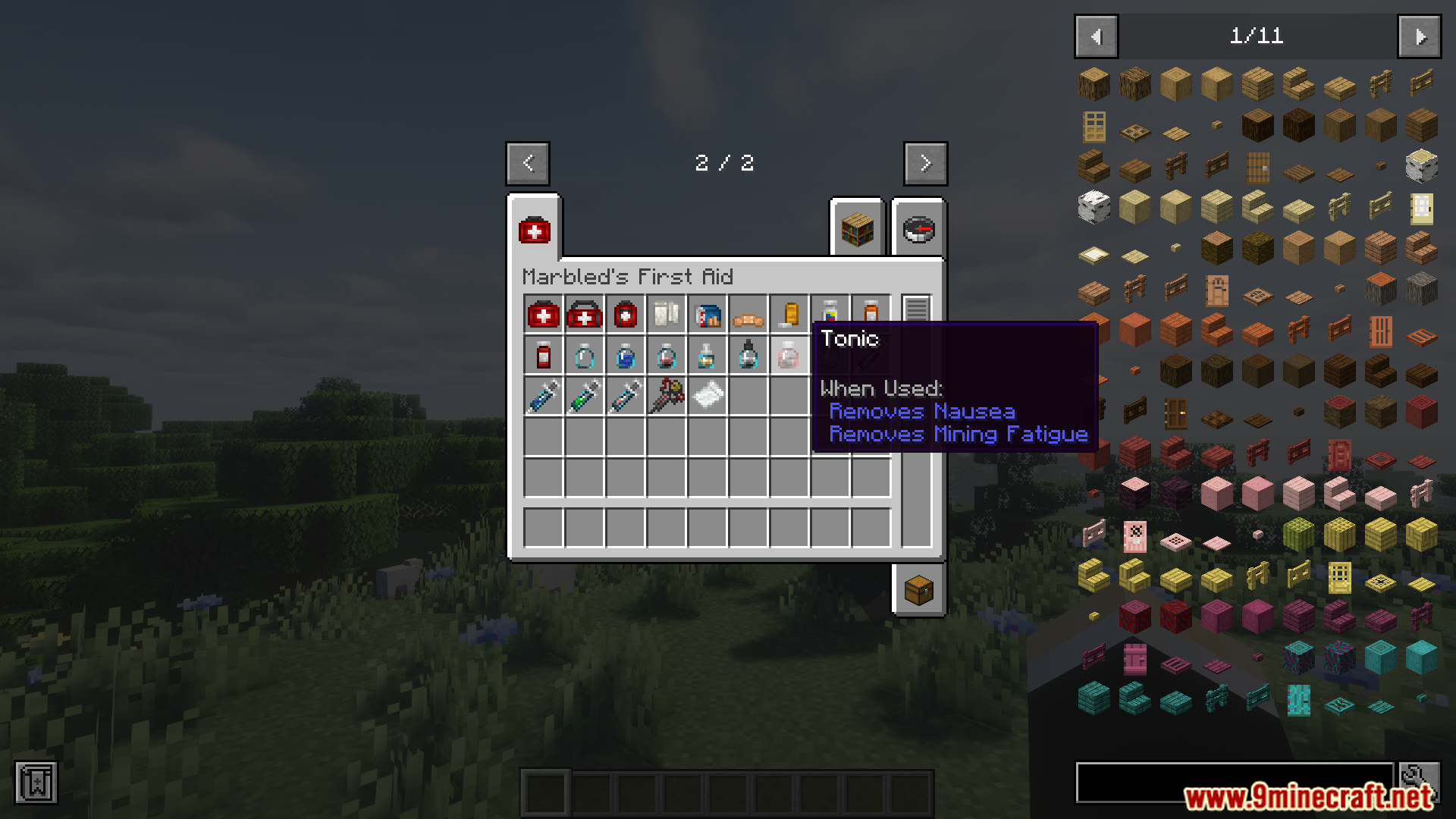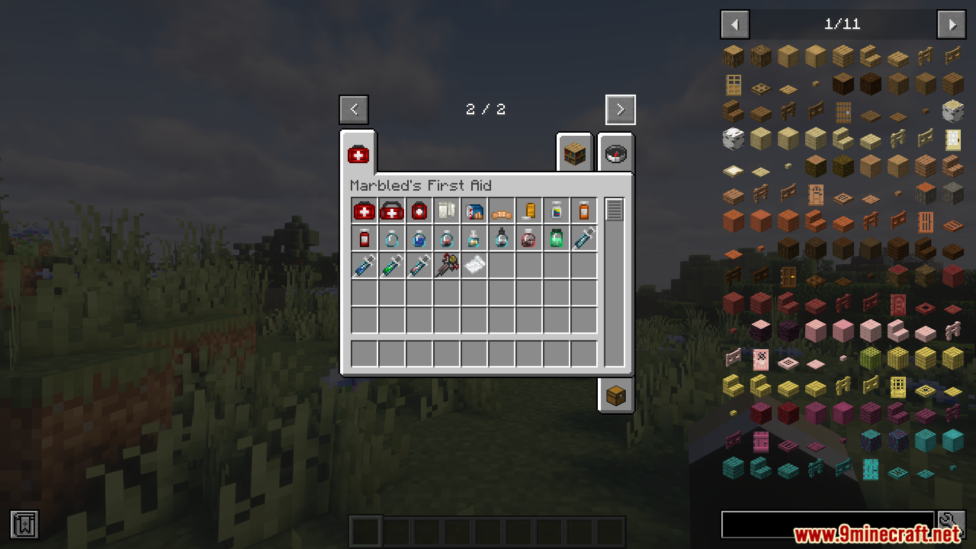 - Adds first aid items across four categories: pills, syringes, medicines, and general remedies.