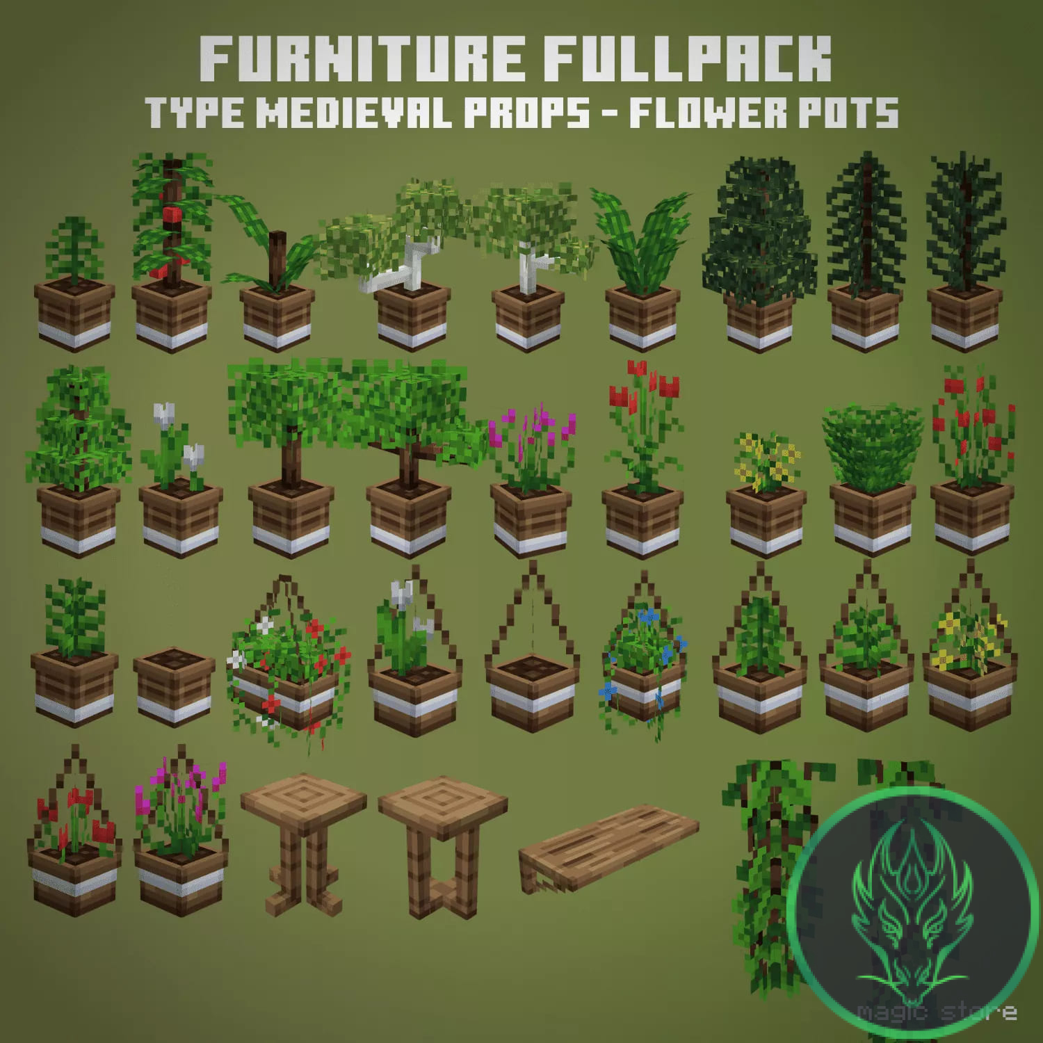 Medieval Furnitures Fullpack V3 Model is a Minecraft furniture pack focused on natural decoration, adding over 40 unique flower and tree pot models to enrich medieval-style builds.