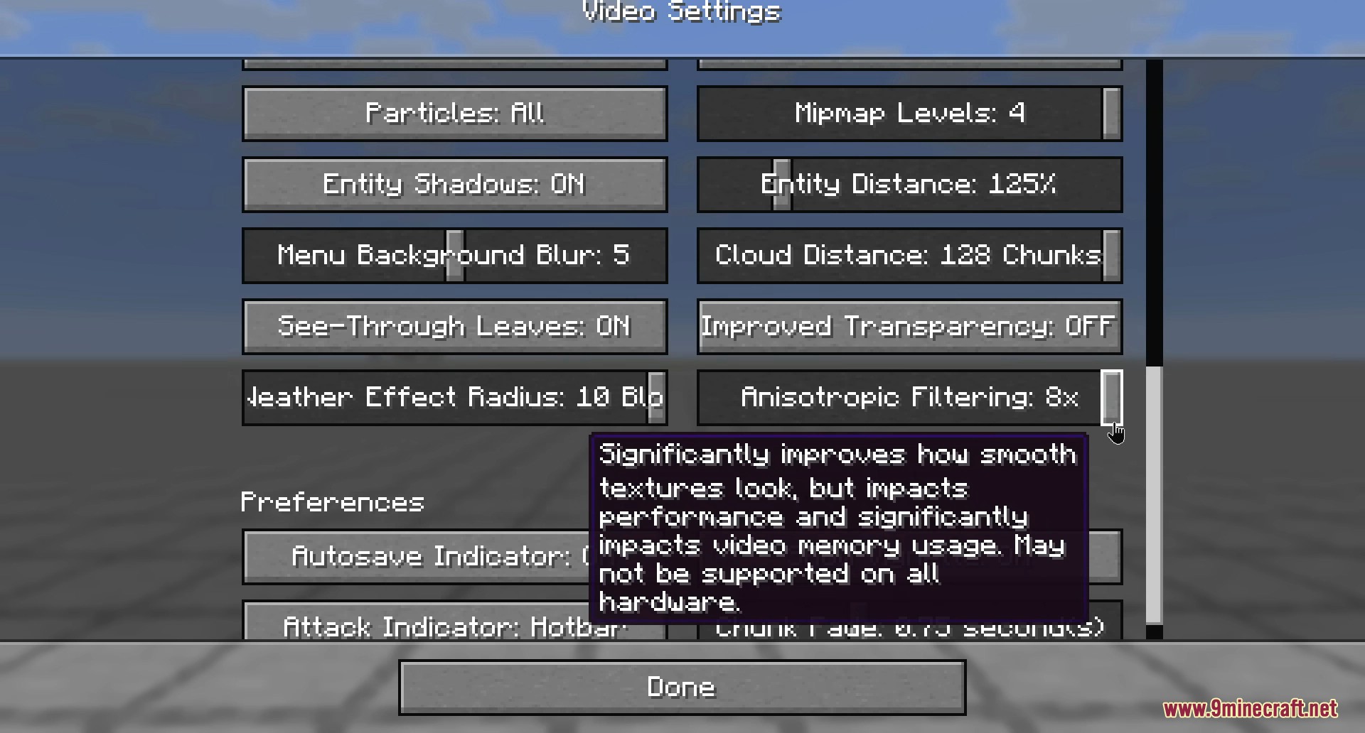 - Anisotropic Filtering – enhances block clarity at angles; options: off, 2x, 4x, 8x.