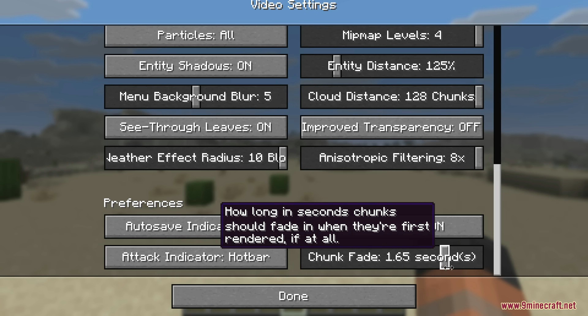 - Chunk Fade Time – controls fade-in time of chunks when loading.