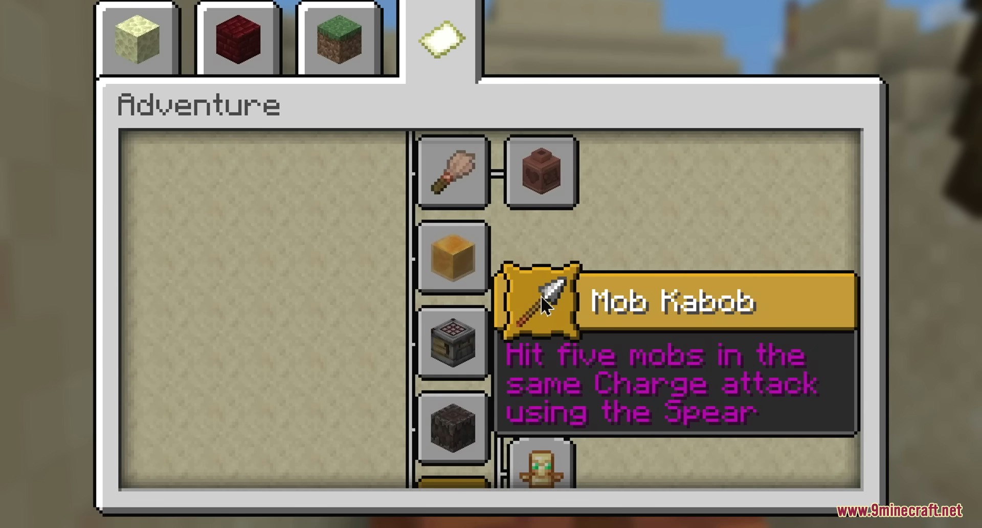 - New advancement: Mob Kabob — hit five mobs in the same Charge attack using the Spear. (Armor stands and mannequins count.)
