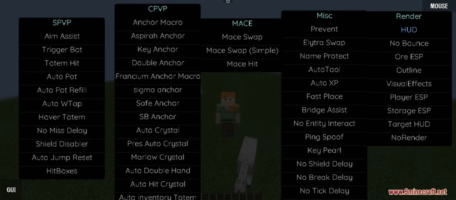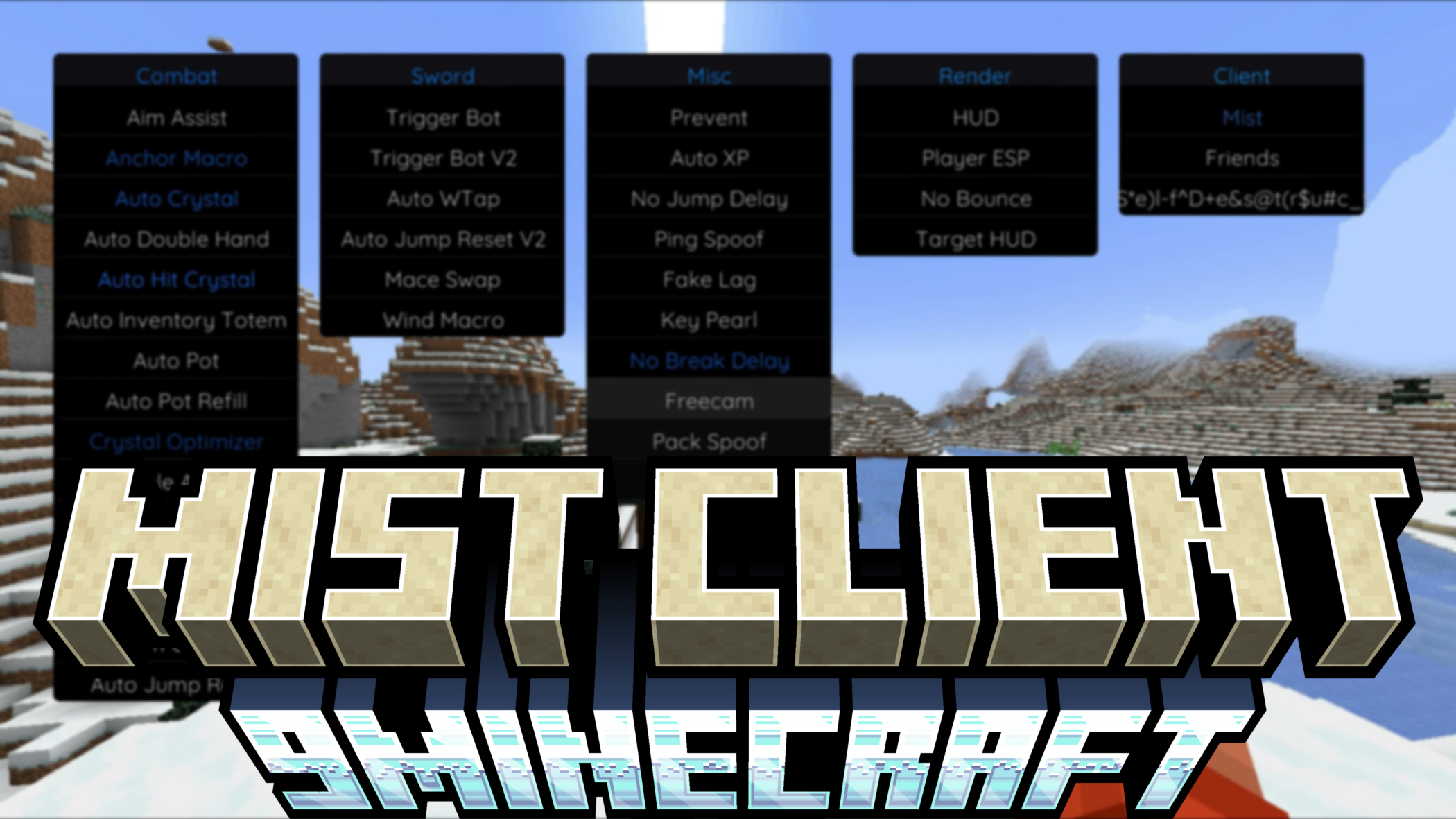 Aim Assist– Helps aim at targetsAuto Crystal– Automatic crystal placement and breakingAuto Pot– Automatically uses potionsShield Disabler– Helps counter shieldsTotem Offhand– Automatically holds totemsNo Miss Delay– Removes attack delay