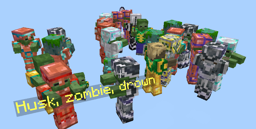 Mobs Spawn With Armor Trims Addon (1.21) appears in armor with decorative patterns. This expansion changes the appearance of the main monster types by adding patterns to their equipment.