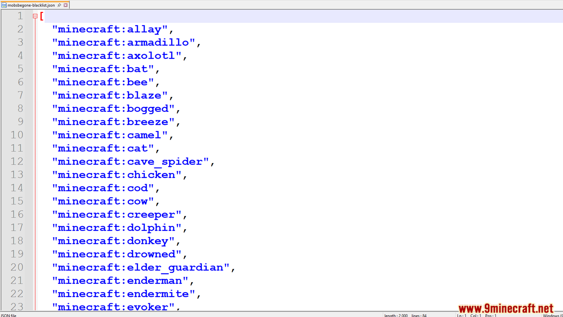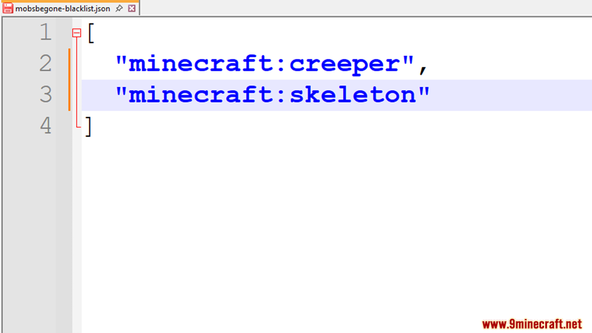 - Disable any vanilla mob or modded by listing its entity ID in a mobsbegone-blacklist.json config file.