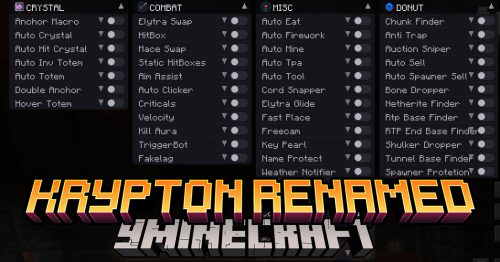 Krypton Renamed Client Mod (1.21.1) is a Ghost Client for Minecraft, focused on PvP, crystal PvP, and utility enhancements. It is designed to be hard to detect, improve PvP performance,…