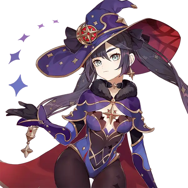 Mona Jenny Mod Model based on Mona Megistus from Genshin Impact in her Halloween Witch outfit featuring black twintails under a starry witch hat (red orb), purple eyes, fur-trimmed purple cape/dress with star motifs, black leggings, magical staff prop, and elegant astrologer curves with jiggle physics.