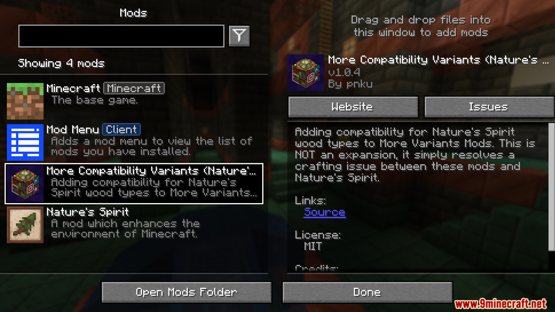 More Compatibility Variants Natures Spirit Mod (1.21.1, 1.20.1) addresses compatibility issues between wood from the Nature’s Spirit mod and other “More Variants” mods, often causing Minecraft crafting recipes (chest, fence, tools, etc.) to malfunction when using modded wood.