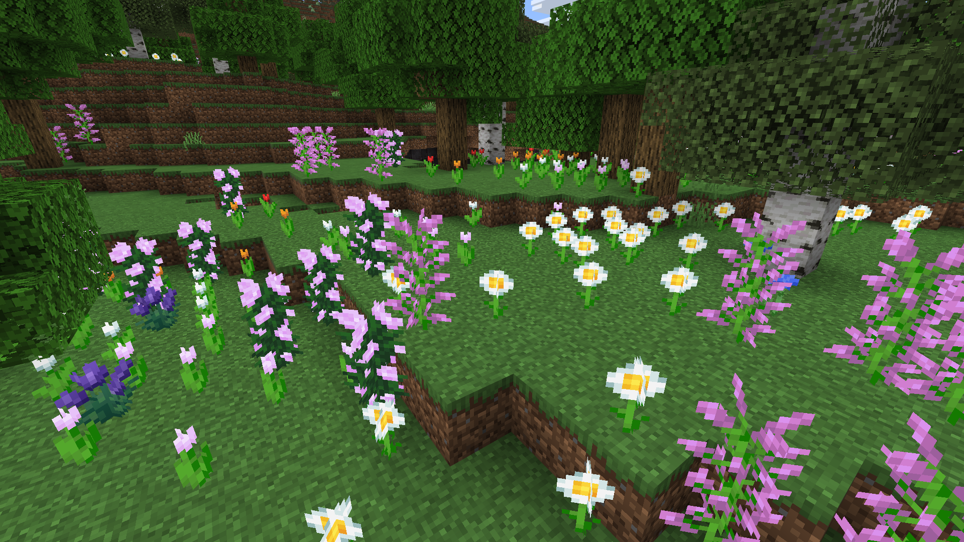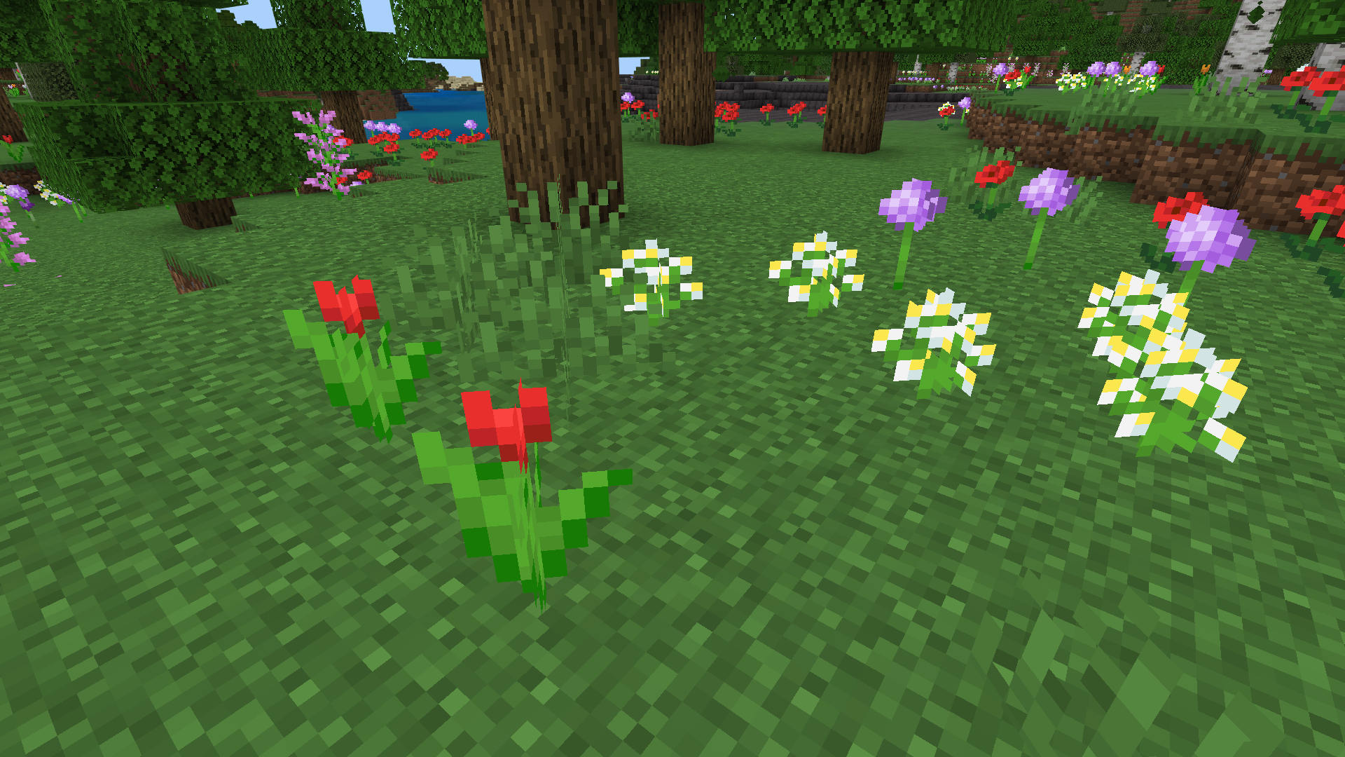 More Flowers Mini Pack Addon (1.21) adds a variety of flowers to areas such as plains, forests, and mountains. Plants like lavender, mustard, and crocuses aid in crafting dyes or gathering seeds.