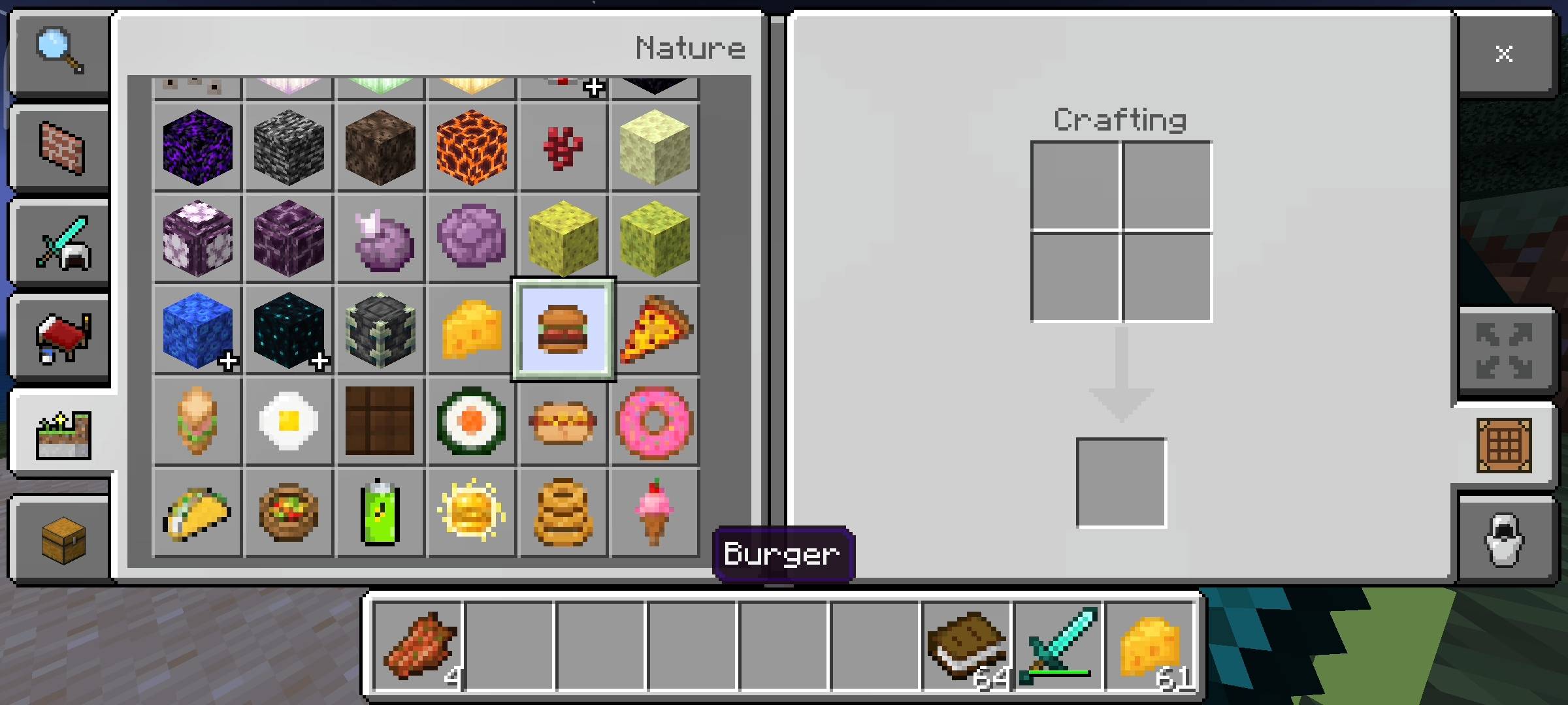 More Foods Plus Addon (1.21) adds 15 new dishes, each with its own unique visuals and recipes. Users utilize ingredients like milk and sugar to create cheese, sandwiches, pizza, or fish tacos. Each food item has accompanying potion effects, such as sushi that allows underwater breathing or ice cream that restores health. Special items like energy drinks and golden sandwiches allow you to eat them even when your hunger bar is full to gain extra speed or stamina.