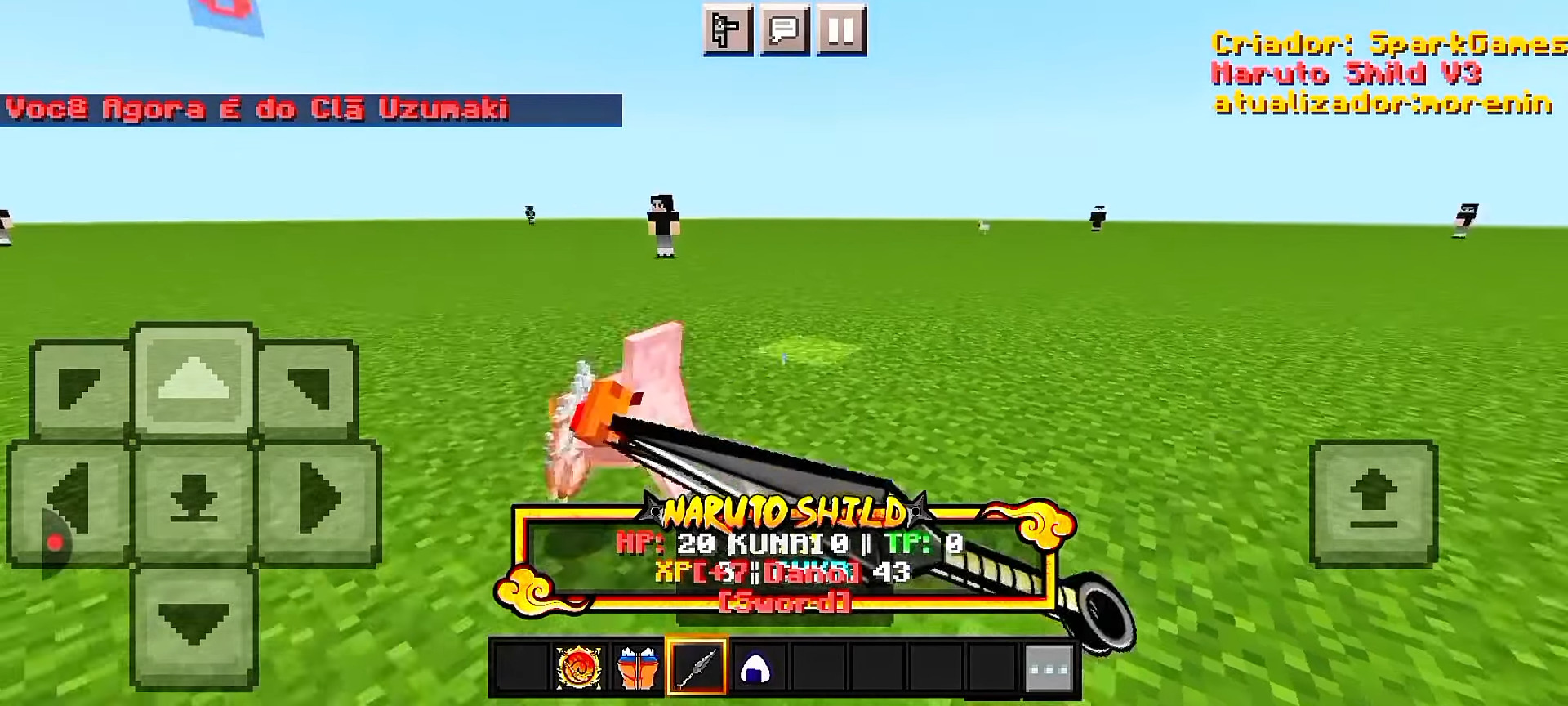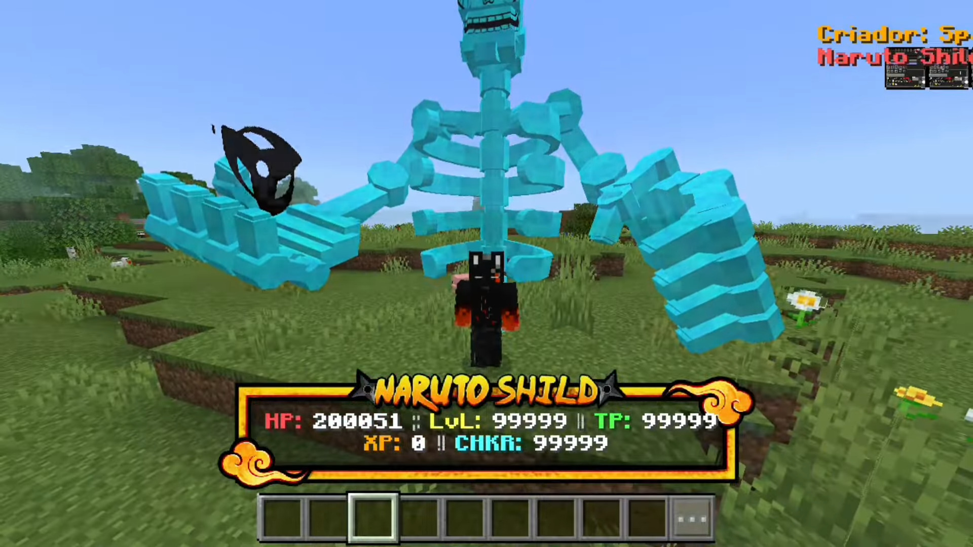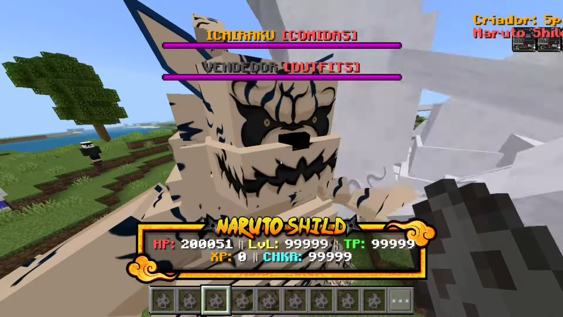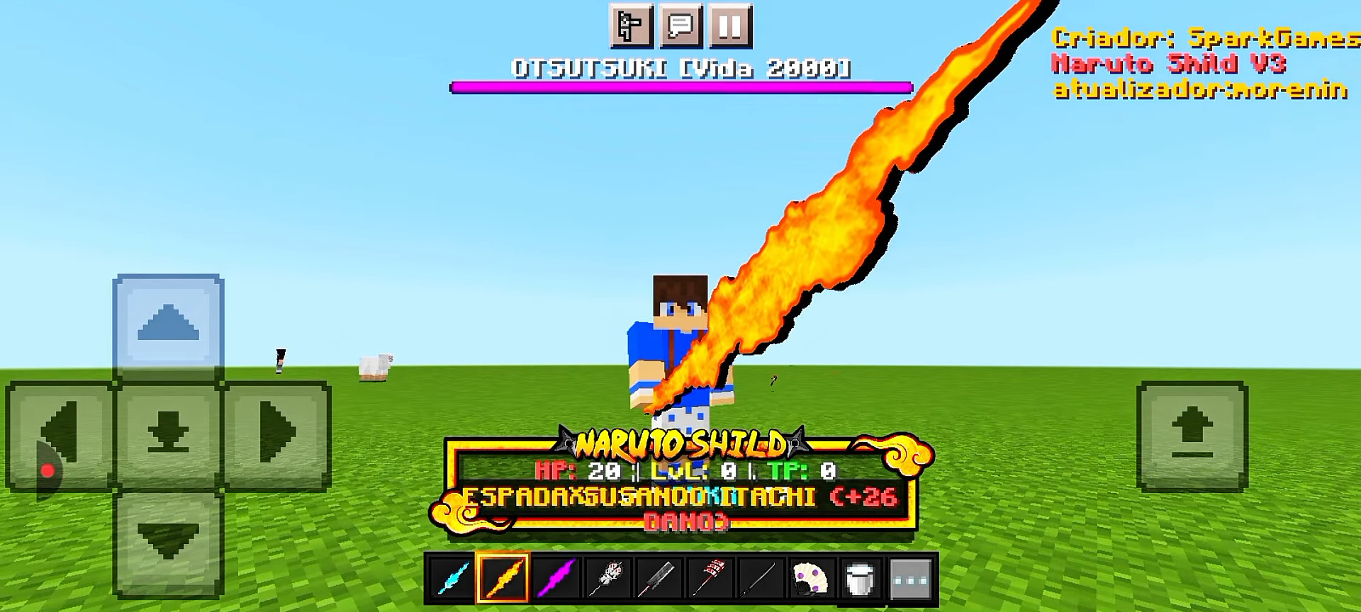 Naruto Shild Addon (1.21) transforms the game into a Naruto ninja world with clan selection menus, tailed beast (bijuu) MK1 modes, Susanoo V2 evolutions, dojutsu like Supreme Rinnegan, custom swords/outfits, RPG stats (health/level/defense), mobs, animations, and jutsus for PvP with realistic models and no major lags on mobile.